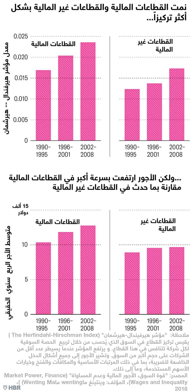 فيحدد الرسم البياني أدناه توجهات "التركيز" في القطاعات، وفقاً لمؤشر هيرفيندال-هيرشمان (HHI)، من عام 1990 إلى عام 2008. إذ تُحسب قيمة مؤشر "هيرفيندال-هيرشمان" بتربيع الحصة السوقية لكل شركة من الشركات المنافسة في القطاع، فترتفع قيمة المؤشر عندما تحصل شركات أقل على نسبة أكبر من مساحة السوق. وتنقسم البيانات فيما بين قطاعي الصناعات المالية وغير المالية. وفي المتوسط، لا تزال جهات التوظيف تزيد من عمليات التركيز منذ عام 1990 في كل من القطاعين المالي وغير المالي على حد سواء. إذ ارتفع متوسط مقياس التركيز لمؤشر "هيرفيندال-هيرشمان" تقريباً بمقدار 40% في القطاع المالي، وحوالي 40% في القطاع غير المالي.