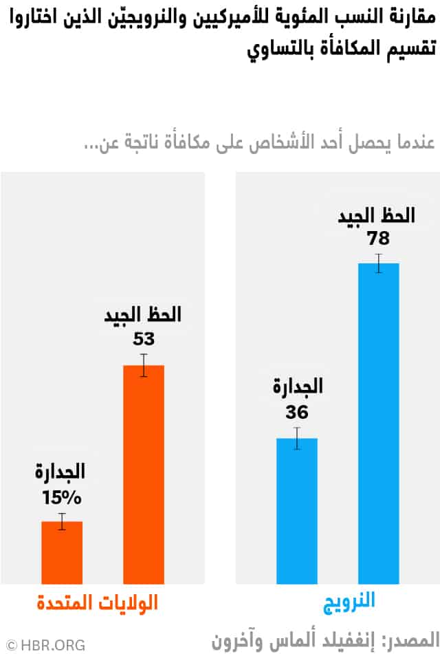 عندما قارنا سلوك المشاركين الأميركيين بسلوك عينة واسعة النطاق من المشاركين النرويجيّن، وجدنا أنّ النرويجيّن كانوا أكثر احتمالاً من الأميركيين لإعادة توزيع المكافأة عندما عكست حالة عدم المساواة التباينات في الحظ. إلا أنّ ما لاحظناه أيضاً قد أثار اهتمامنا، إذ أصبح النرويجيون أكثر قبولاً لحالة عدم المساواة بصورة ملحوظة عندما عكست تلك الحالة مكافأة الجدارة وليس الحظ الخالص.