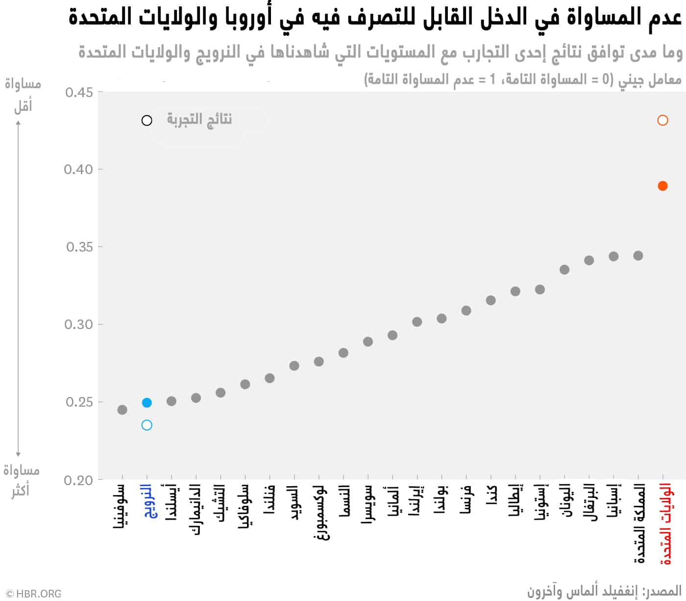 إنّ متوسط مستويات عدم المساواة التي ظهرت لدى الأميركيين والنرويجيّن في التجربة قريب جداً من المستوى الفعلي لعدم المساواة في البلدين، ما يشير إلى أنّ التجربة تناولت توجّه العالم الحقيقي بشأن قبول عدم المساواة بين المشاركين. وقد يكون لهذه الاختلافات في التوجه أصول مختلفة، ولكن هناك آلية تبدو صحيحة ظاهرياً وتتمثل في أنّ قبول حالة عدم المساواة لدى الأشخاص (بصورة جزئية على الأقل) تشكلها المؤسسات في المجتمع، فإذا كان الموظفون يصلون إلى مستويات عالية من حالات إعادة توزيع المكافآت (كما في النرويج)، فإنهم يصبحون أكثر تردداً في قبول عدم المساواة.