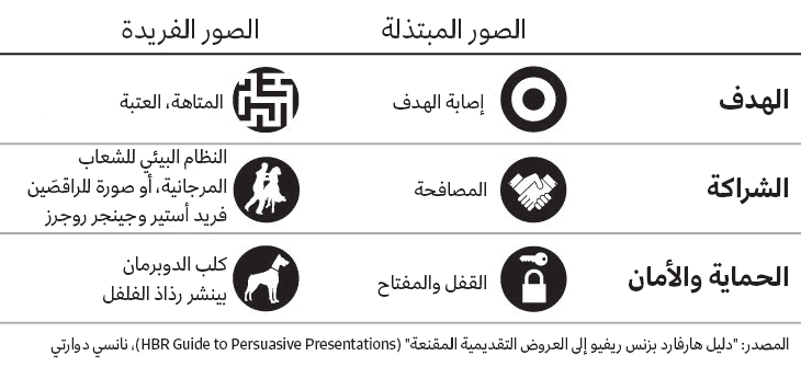 - استخدام صور مكررة ومملة. يؤدي استخدام الصور المكررة أو المبتذلة إلى فقدان الجمهور تركيزه. هل ترغب في أن يكون عرضك التقديمي أفضل من العروض الأخرى التي شاهدها جمهورك؟ أجرِ جلسة عصف ذهني لاقتراح العديد من الأفكار والمفاهيم التي تتعلق بالعناصر البصرية في العرض التقديمي، وتجاهل الأفكار الأولى التي تتبادر إلى ذهنك لتوليد أفكار جديدة ومبتكرة، لأن تلك الأفكار تتبادر إلى ذهن الجميع أيضاً. لذلك، ربما سبق لك أن شاهدت هذه الأفكار ملايين المرات في العروض التقديمية الأخرى. أنشئ العديد من الأفكار لكل مفهوم تريد توضيحه، وسيساعدك ذلك في توليد أفكار أصلية ومبتكرة.
