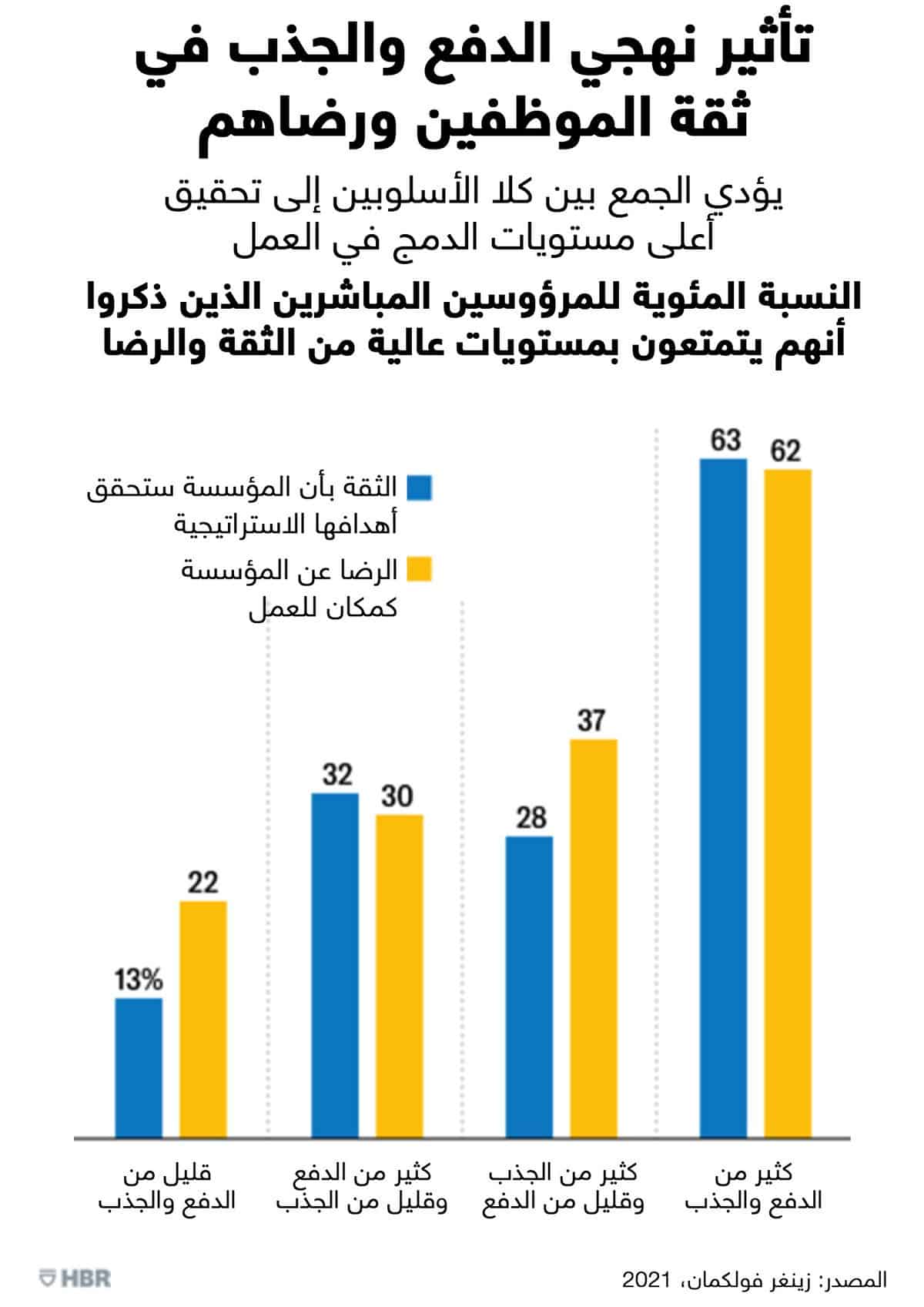 في حين أن بياناتنا توضح أنه يمكن لمعظم القادة الاستفادة من تحسين قدرتهم على جذب الآخرين أو إلهامهم، فقد كشف بحثنا أن القادة الذين استخدموا كلاً من نهج الدفع والجذب بفعالية كانوا في نهاية المطاف من أنجح القادة.