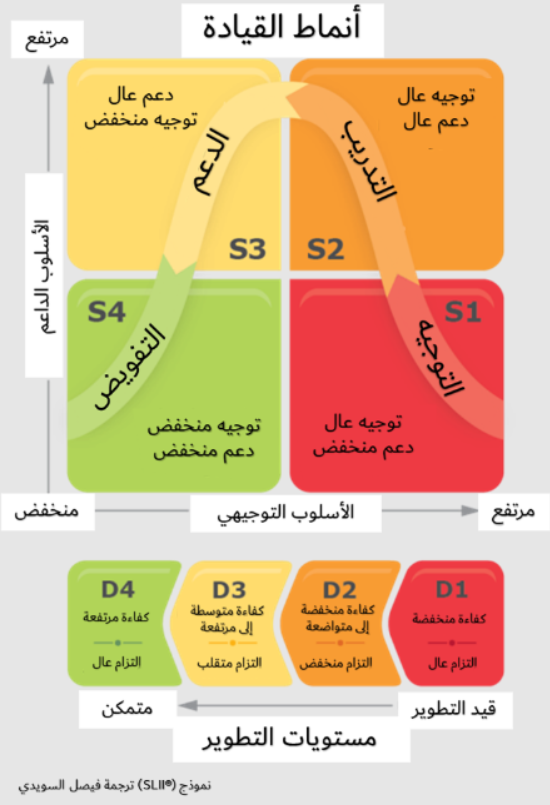 "يبذل القائد في هذا النمط المجهود الأكبر في الدعم والمساندة أكثر من التوجيه، لأن المرؤوس قد وصل إلى مرحلة يكون فيها مستوى الكفاءة من متوسط إلى مرتفع، إلا أن الالتزام يصبح متقلباً فينخفض أحياناً ويرتفع في أخرى".