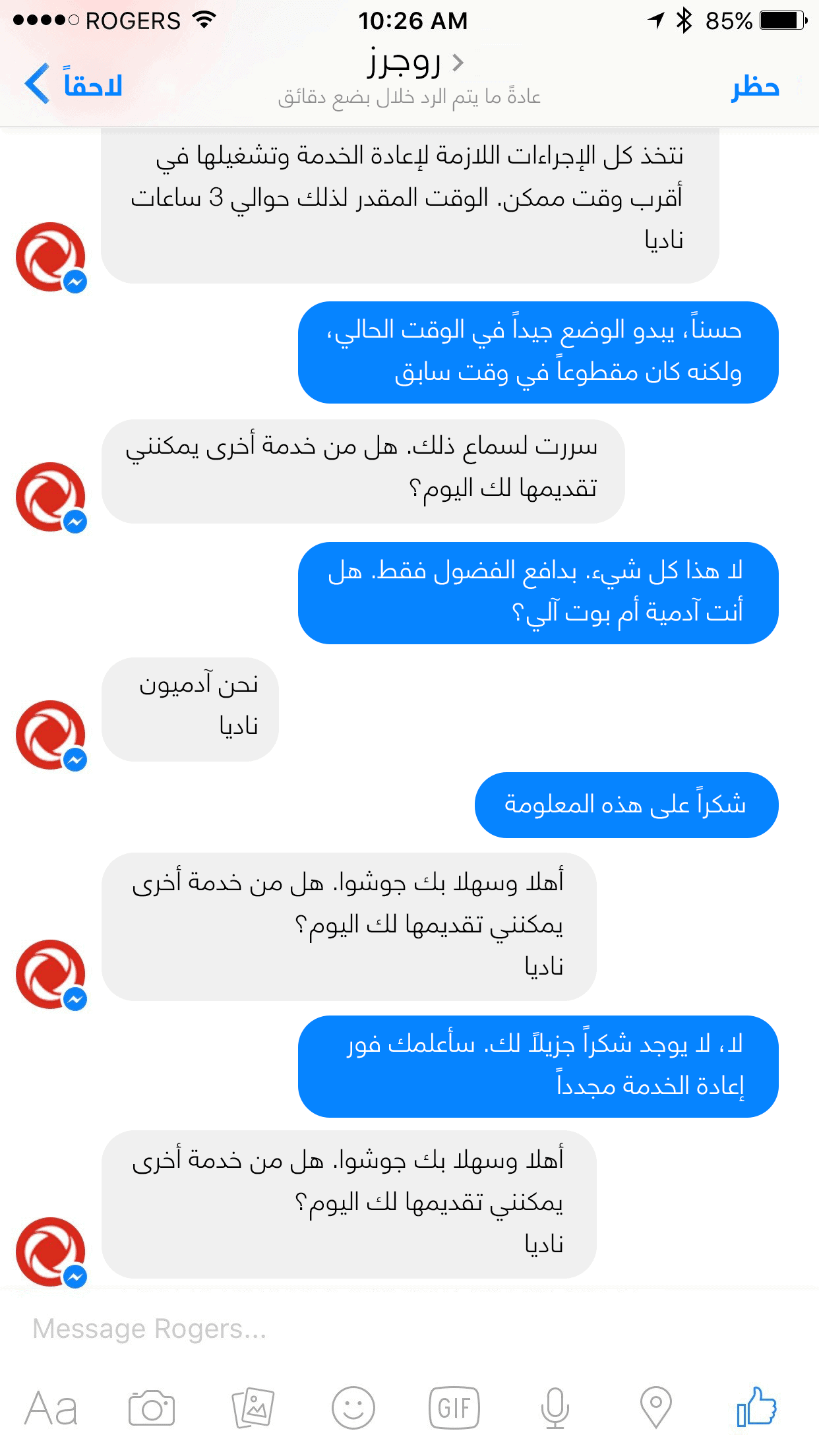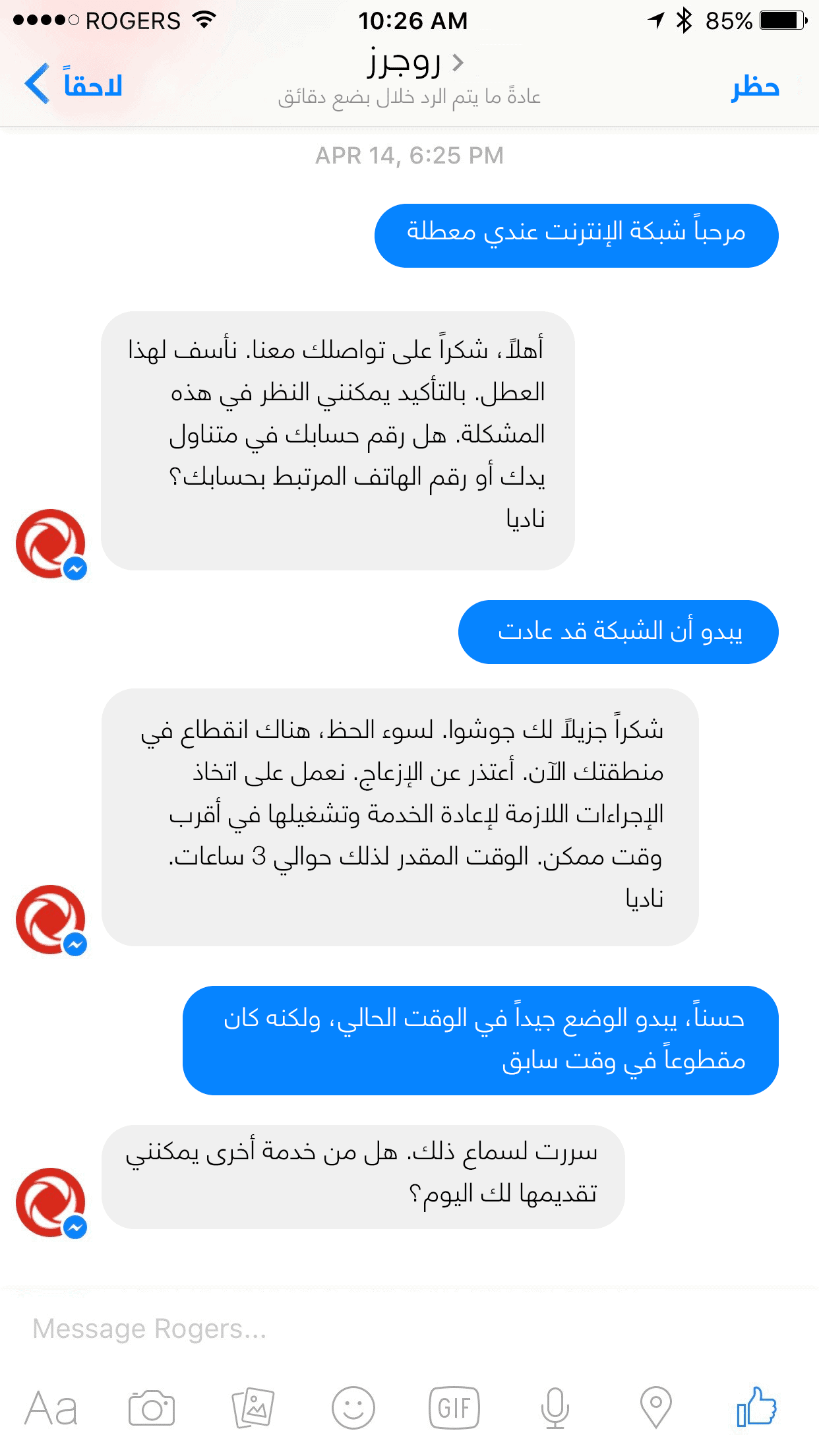 ثانياً، إن تطبيق المراسلة هو شكل من أشكال الاتصال السريع والملائم. فمن خلاله لن تضطر للذهاب إلى الشركة وانتظار الموظف ريثما يجد الحل لمشكلتك. ففي مرحلة ما، طلبتُ من المندوبة أن تراسلني عندما تتوفر لديها أي مستجدات، وقد فعلت ذلك. ولكن في حال كنت لا أستخدم البريد الإلكتروني، فلن أجد أي وسيلة لمعرفة ما إذا كان قد تمت معالجة مشكلتي. وفي المقابل، يخبرك "ماسنجر" بالمدة التي تحتاجها الشركة عادةً للرد على رسائلك (بالنسبة لشركة "روجرز"، فقد ذكروا أن الرد قد يصل في غضون بضعة دقائق، وهذا ما أكدته التجربة).