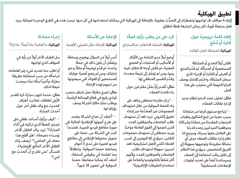 سواء كان عليك الإجابة عن سؤال استقصائي طرحه عليك مديرك أو عميلك، أو اضطررت إلى تقديم شخص أو الترحيب به دون سابق إنذار، أو أردت تقديم ملاحظات فورية لأحد زملاء العمل، أو كنت تحتاج إلى التواصل الاجتماعي في تجمع غير رسمي، فعليك تعلم المهارات التي تعينك على اغتنام الموقف باعتباره فرصة لإثبات تميُّزك وإبهار الآخرين وإحراز تقدم ملموس نحو أهدافك المنشودة، دون الاكتفاء بمحاولة النجاة من الموقف فحسب.