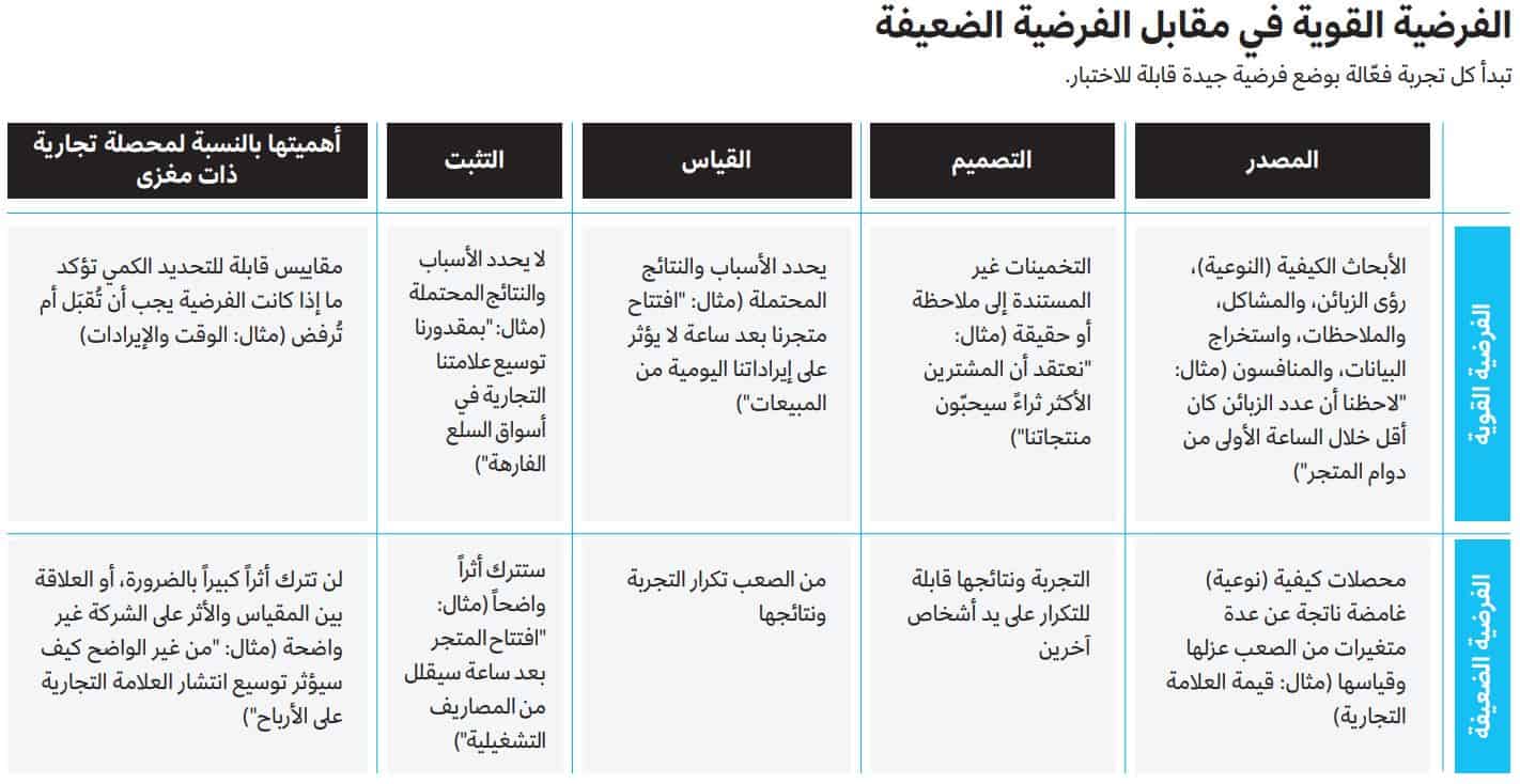إذا ما كنتم تريدون تحدّي الفرضيات بطريقة فعّالة، فلا بد من أن تُصاغ على هيئة فرضيات يمكن تأكيدها أو دحضها بطريقة كمية. "عندما تستطيعون قياس ما تتحدثون عنه والتعبير عنه بالأرقام، فإنكم تعرفون شيئاً عنه"، كما قال لورد كلفن، أحد أبرز الشخصيات العلمية والهندسية في القرن التاسع عشر. "أما عندما لا تكونون قادرين على قياسه، ولا تستطيعون التعبير عنه بالأرقام، فإن معرفتكم هي من النوع الرديء وغير المُرضي". (راجعوا الفقرة الجانبية التي تحمل عنوان "الفرضية القوية في مقابل الفرضية الضعيفة"). فالتجربة التي تُنتج براهين تناقض فرضية معيّنة تسمح لنا بالتعرف على الأخطاء الكامنة في طريقة تفكيرنا أو حكمنا على الأمور، وتعديل الفرضية، ومن ثم إعادة صياغتها بطريقة جديدة. وتقود هذه العملية التكرارية من الاختبار وإعادة التنقيح في نهاية المطاف إلى فرضيات أقوى.
