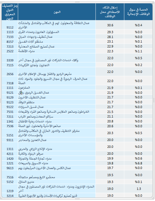 الجدول رقم 1: أكثر المهن عرضة للاختفاء بسبب الذكاء الاصطناعي في الإمارات العربية المتحدة