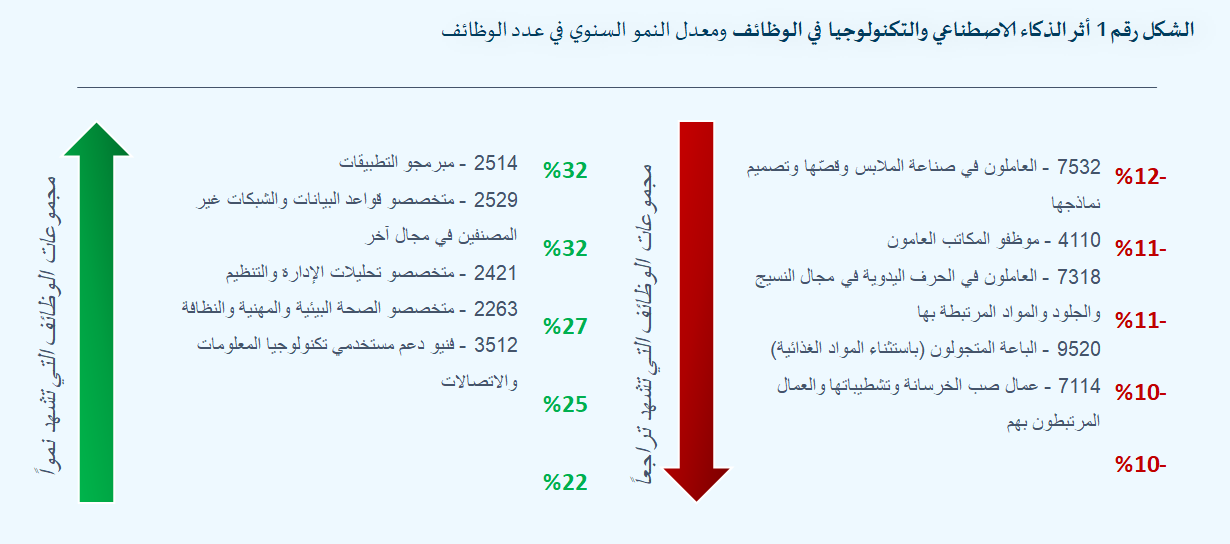 يبيّن الشكل رقم 1 أدناه الوظائف التي من المرجح أن تبقى والتي من المرجح أن تختفي بحلول عام 2025. على سبيل المثال، من المتوقع أن يشهد الطلب على مبرمجي التطبيقات ومتخصصي قواعد البيانات والشبكات أعلى نمو بنسبة 32%، وفي المقابل يتوقع أن ينخفض ​​الطلب على العاملين في مجال صناعة الألبسة ومصممي الباترونات (نماذج أبعاد الجسم على الورق) ومن يؤدون عملية قص القماش (المقص دار)، بنسبة 12%.