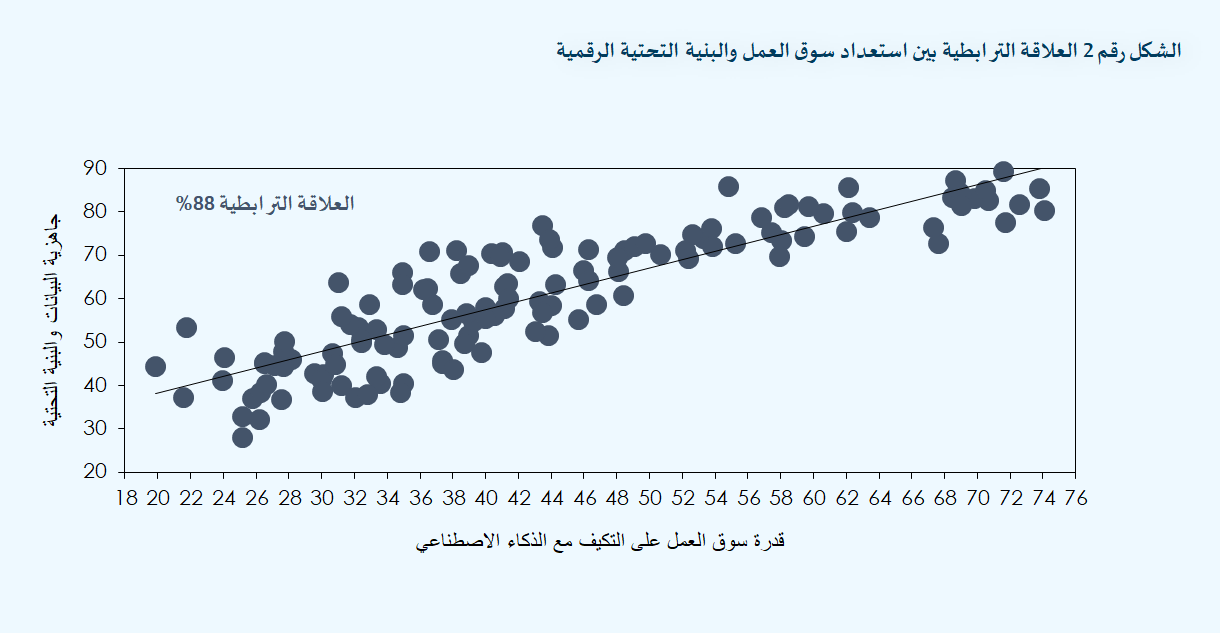 لا يرجع التفاوت في آثار الذكاء الاصطناعي في أسواق العمل بين البلدان فحسب إلى الهياكل المهنية غير المتجانسة، أو إلى درجة تجهيز العاملين وإعدادهم للعمل بكفاءة وفعالية جنباً إلى جنب مع الآلات، ولكن أحد الأسباب المهمة لهذا التفاوت هو عدم المساواة في الوصول إلى الذكاء الاصطناعي والبيانات. فقد خلص تحليل مؤسسة وايتشيلد إلى وجود ترابط قوي بين قدرة سوق العمل في الدولة على التكيف مع الذكاء الاصطناعي من جهة وجاهزية البيانات والبنية التحتية الرقمية من جهة أخرى (الشكل رقم 2). تستخدم عدة اقتصادات ناشئة بالفعل تكنولوجيات الذكاء الاصطناعي الأساسية مثل الزراعة الذكية وتحديد الجدارة الائتمانية، لكن تكنولوجيات الذكاء الاصطناعي المتقدمة لم تُعتمد على نطاق واسع حتى الآن على الرغم من أنها توفر فرصاً هائلة للتنمية الاقتصادية.