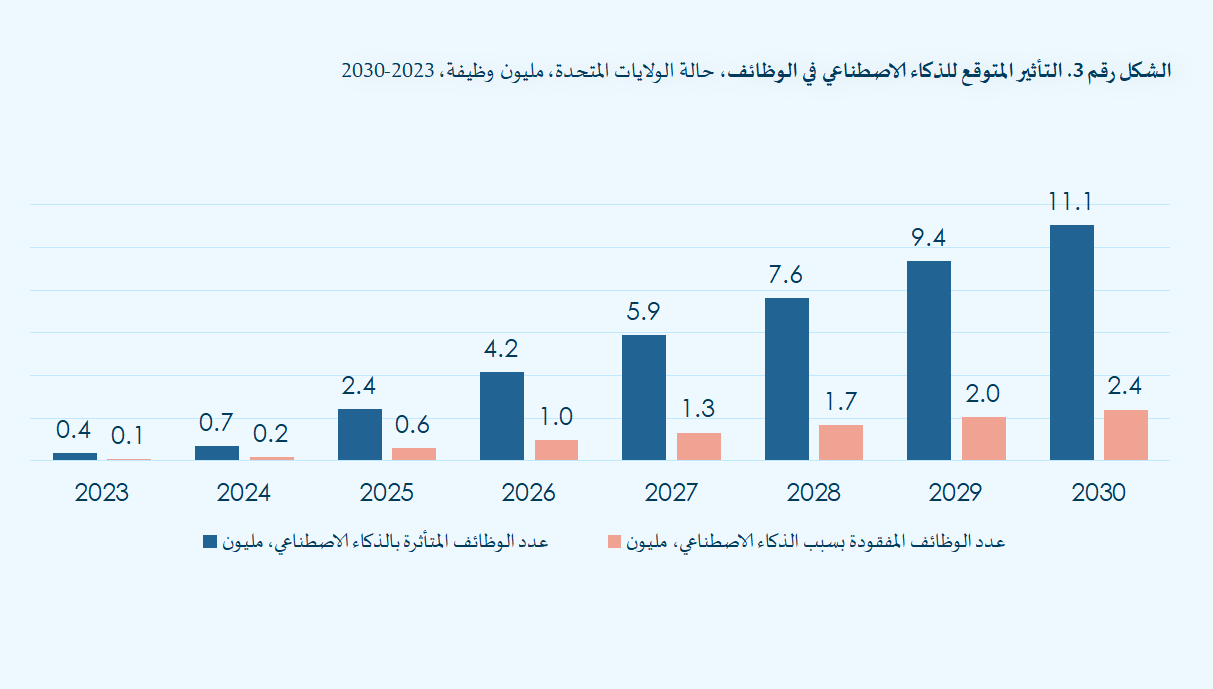 تمثل حالة الولايات المتحدة مثالاً توضيحياً مقنعاً، إذ من المتوقع أن يؤدي الدمج الاستراتيجي للذكاء الاصطناعي في أماكن العمل إلى خلق وظائف أكثر بـ 4.8 أضعاف الوظائف التي من المحتمل أن تختفي بحلول عام 2030 (الشكل رقم 3)، وهذا يؤكد الدور الحاسم للأطر الرقمية وأطر البيانات المتقدمة في تخفيف تحديات التوظيف إضافة إلى خلق فرص العمل وسط ثورة الذكاء الاصطناعي التي نشهدها.