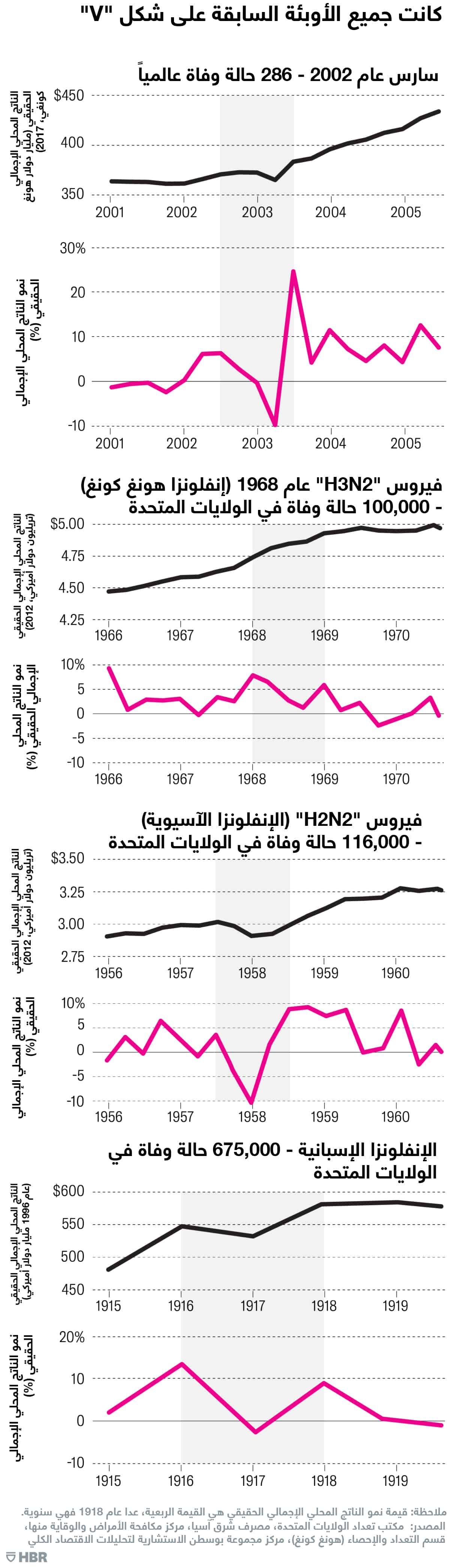 مجدداً، يجدر بنا إعادة دراسة التاريخ كي نتمكن من تحديد مسار التأثير المحتمل لفيروس "كوفيد-19" عملياً. في الواقع، فإن التصور الذي له الشكل "V" يحتكر المشهد العملي للصدمات السابقة، بما في ذلك الأوبئة مثل سارس، والإنفلونزا الآسيوية في عام 1968، وإنفلونزا هونغ كونغ في عام 1958، والإنفلونزا الإسبانية في عام 1918.