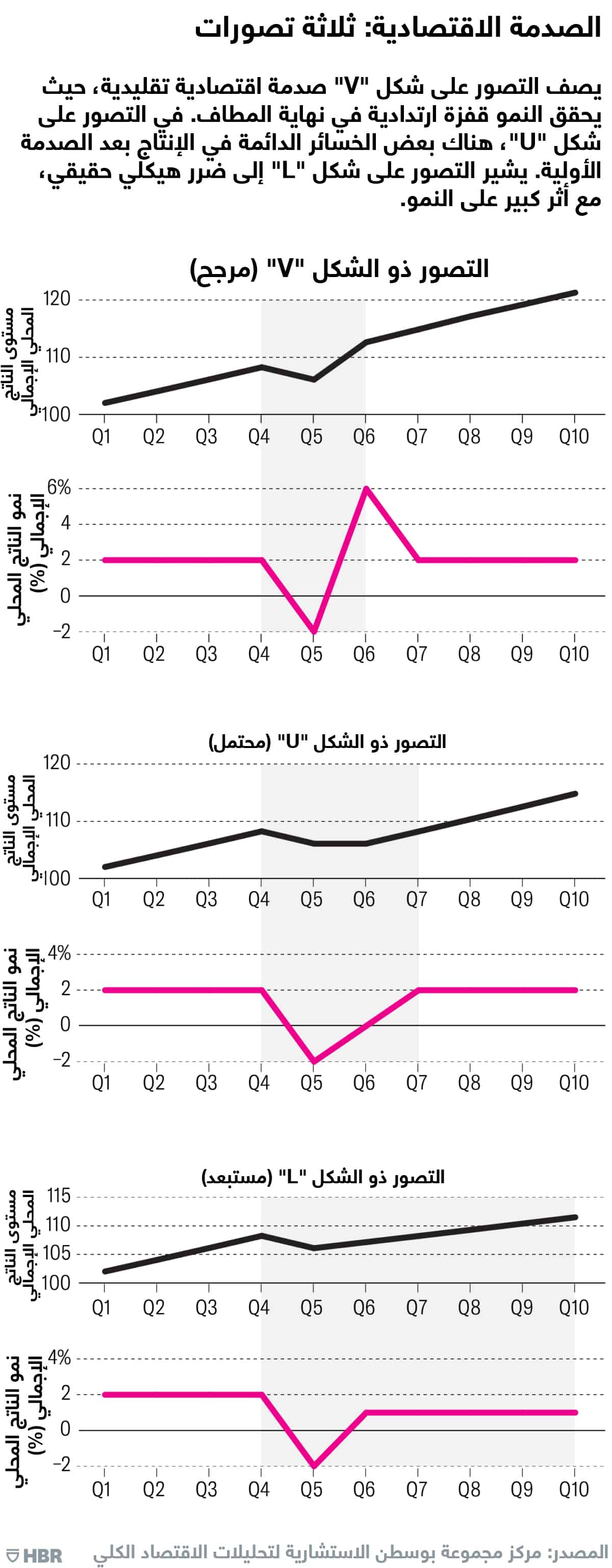 سواء كان بإمكان الأنظمة الاقتصادية تجنب الركود أم لا، فإن المسار إلى تحقيق النمو في ظل ظروف كهذه سوف يعتمد على مجموعة من العوامل المحركة، مثل درجة تأخر الطلب أو ضياعه، وما إذا كانت الصدمة تمثل ارتفاعاً مؤقتاً أم مستداماً، وما إذا كان هناك أضرار هيكلية، هذا بخلاف العوامل الأخرى. إذن، من المعقول أن نرسم ثلاثة تصورات شاملة، سنرمز إليها بالأشكال "V" و"U" و"L".