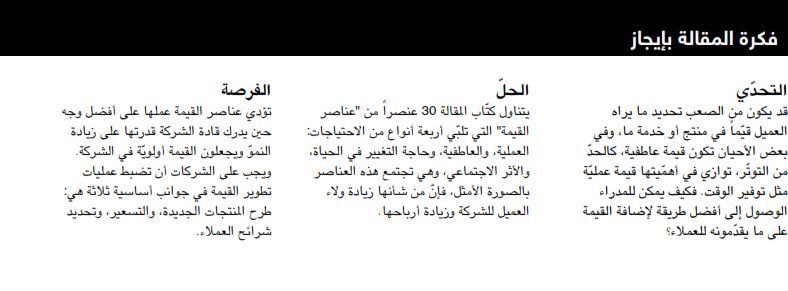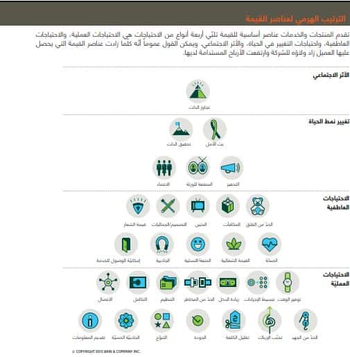 وقد قمنا بتحديد ثلاثين عنصراً من "عناصر القيمة"- وهي خواص أساسية بأشكالها الجوهرية والمنفصلة (انظر الملحق "هرم عناصر القيمة"). تتوزع هذه العناصر على أربع فئات: عناصر عملية، وعناصر عاطفية، وعناصر لها القدرة على تغيير نمط الحياة، بالإضافة إلى عناصر الأثر الاجتماعي. بعض العناصر ذات تركيز على الجوانب ذاتية، حيث تعنى باحتياجات المستهلك الشخصية بالدرجة الأولى. فالعنصر المتعلق بإحداث التغيير في الحياة، وهو الحماسة، هو جزء جوهري من منتجات شركة "فيتبيت" (Fitbit) الخاصة بتسجيل النشاط الرياضي. وهنالك عناصر أخرى تركّز على الجانب الخارجي، إذ تساعد المستهلك على التفاعل مع العالم الخارجي أو استكشافه. إن العنصر العملي الخاص بالتنظيم هو أمر أساسي في شركة كونتينر ستور التي تبيع منتجات للتخزين، وشركة إنتويت تيربو تاكس التي تساعد المستخدم على حساب ضرائبه، لأن كلتا الشركتين تساعدان المستهلكين على التعامل مع الأمور المعقدة في حياتهم.