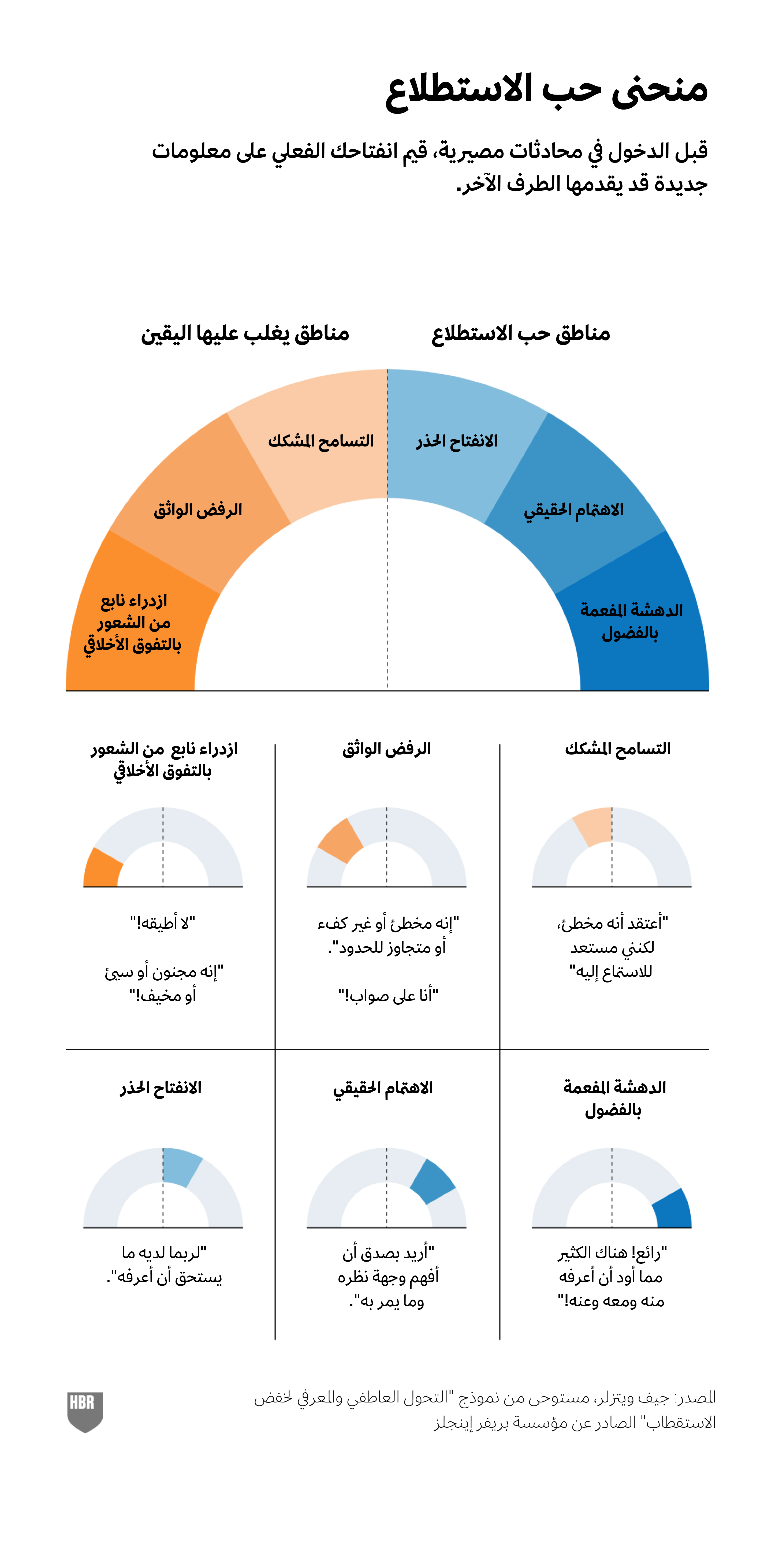 يساعدك منحنى حب الاستطلاع (المستوحى من نموذج وضعته مؤسسة بريفر إينجلز غير الربحية) على إدراك العقلية التي تدخل بها إلى المحادثة. انظر إليه باعتباره أهم مؤشر ذهني على القادة مراقبته، تماماً مثلما يراقب الطيار لوحة العدادات في قمرة القيادة. يمثل النصف الأيسر من المنحنى 3 مناطق يغلب عليها اليقين: الاستعلاء الأخلاقي، الرفض الواثق، التسامح المشكك. ويمثل النصف الأيمن 3 مناطق لحب الاستطلاع: الانفتاح الحذر، الاهتمام الحقيقي، الدهشة المفعمة بالفضول.