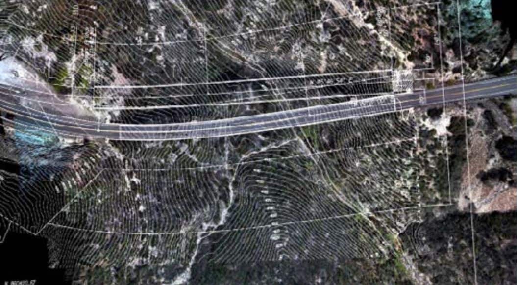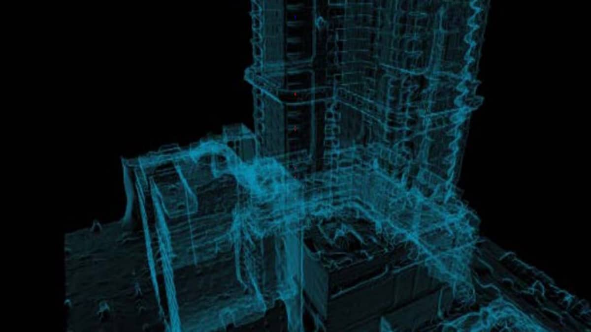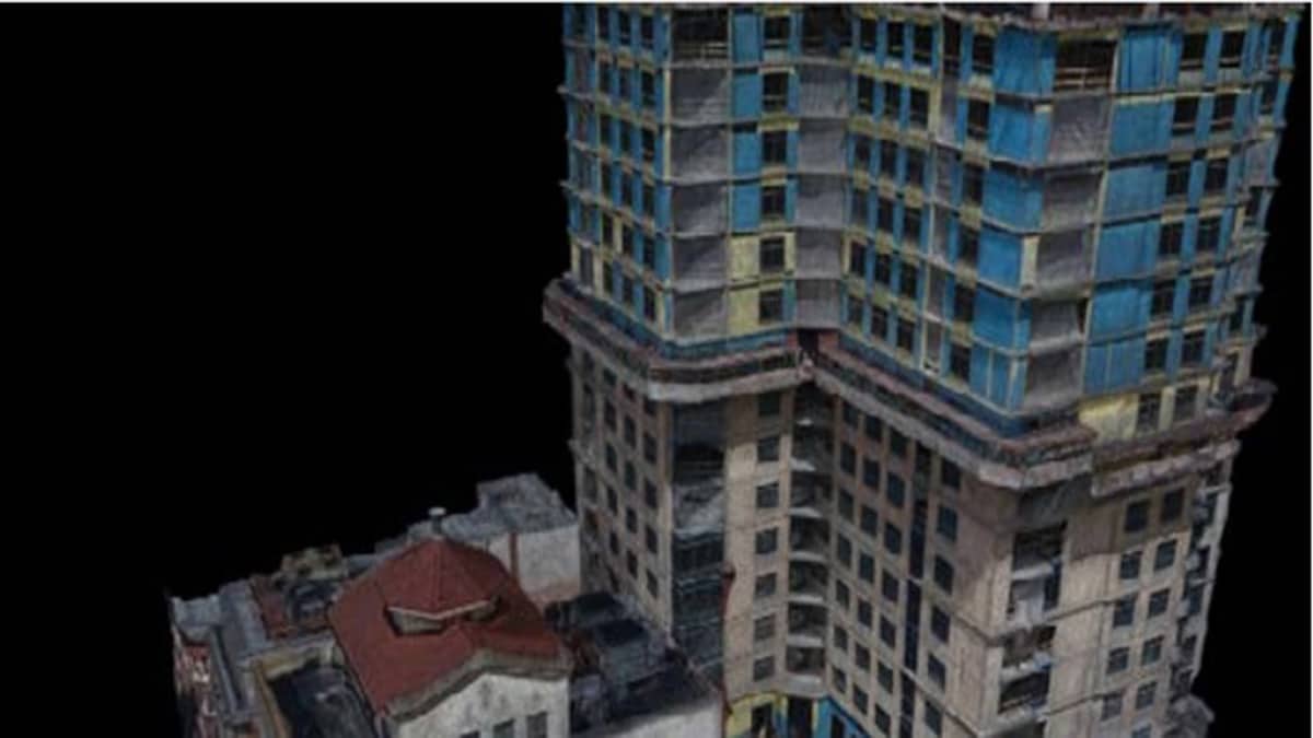 صورة ملتقطة بطائرات بلا طيار وضعت على صورة خطية ثلاثية الأبعاد بغية صنع نموذج مناسيب لبناية حضرية بينما كانت قيد الإنشاء.