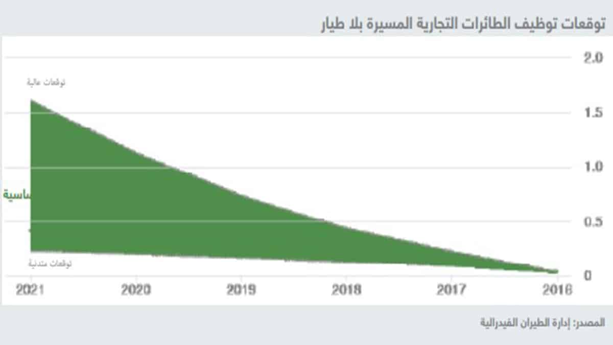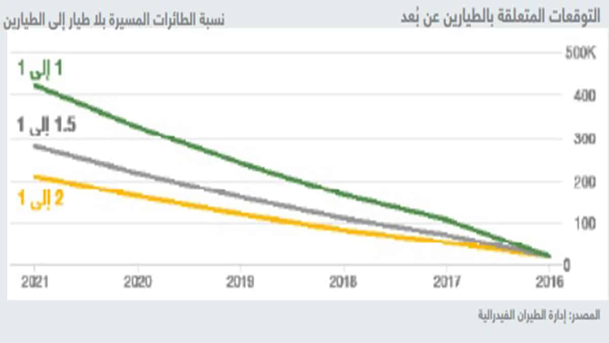في كل سيناريو، سيزداد عدد الطيارين عن بُعْد والمُسجلة أسماؤهم كمشغلين تجاريين، غير أن النمو سيكون أبطأ نوعاً ما لو عدلت إدارة الطيران الفيدرالية لوائحها التي تسمح لطيار واحد بتشغيل العديد من الطائرات بلا طيار في آن واحد. وستحد اللوائح التي تسمح بالتحليق الذاتي من النمو بقدر أكبر، غير أنها ستزيد من الحاجة إلى مهندسي البرمجيات ومراقبي حركة المرور الجوي للطائرات المسيرة بلا طيار.