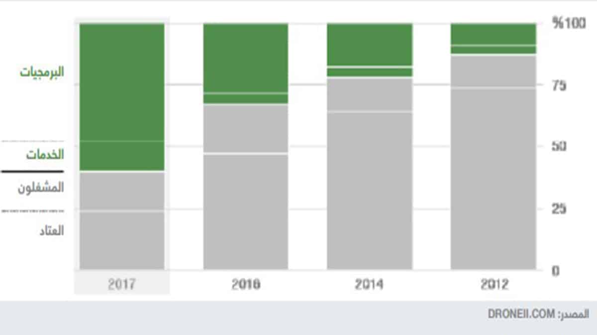تبتعد الاستثمارات في الطائرات بلا طيار عن العتاد والمشغلين وتتجه تدريجياً إلى البرمجيات والخدمات. وستشجع الطائرات بلا طيار على انتشار هذا التوجه بقدر أكبر.