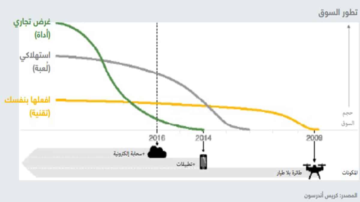 انطلقت شركات، بما في ذلك شركتي، من هذا المنطلق. فقد أتاحت المكونات القوية زهيدة التكلفة وأسلوب تفكير المُصنّع للمتحمسين ورواد الأعمال، بإعادة تخيل الطائرات بلا طيار؛ لا على أنها تهبط من أعلى في السماء بل على أنها تقلع من الأرض. وبدلاً من أن ننظر إليها على أنها "طائرات بلا طيار"، نظرنا إليها باعتبارها "هواتف ذكية ذات مراوح". وحيث أنها تطورت بوتيرة صناعة الهواتف الذكية نفسها، لا صناعة الطائرات، تحولت الطائرات بلا طيار من أجهزة خاصة بالقرصنة إلى أدوات في أيدي أصحاب الهوايات، ومنها إلى ألعاب تقل تكلفتها عن 100 دولار في المتاجر المحلية الكبرى خلال أقل من أربع سنوات؛ وقد يكون هذا أسرع انتقال لتكنولوجيا تستخدم في وكالة المخابرات المركزية إلى تكنولوجيا تباع في متجر "كوستكو" في التاريخ. منذ خمس سنوات، كانت العقبة التجارية الأساسية أمام "الطائرة بلا طيار" هي أن لها دلالات عسكرية. والآن، ينظر الناس للطائرة نظرتهم إلى الألعاب. هل تَحَوَّل معنى أي كلمة من مفهوم "سلاح" إلى "لعبة" أسرع من الطائرة بلا طيار؟