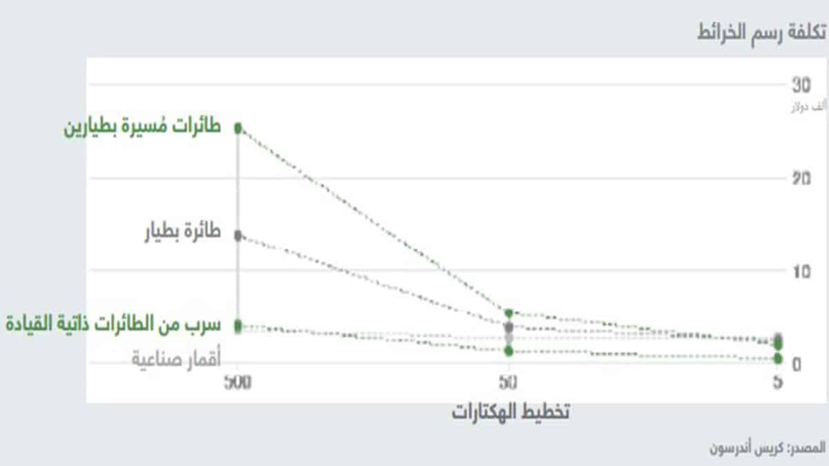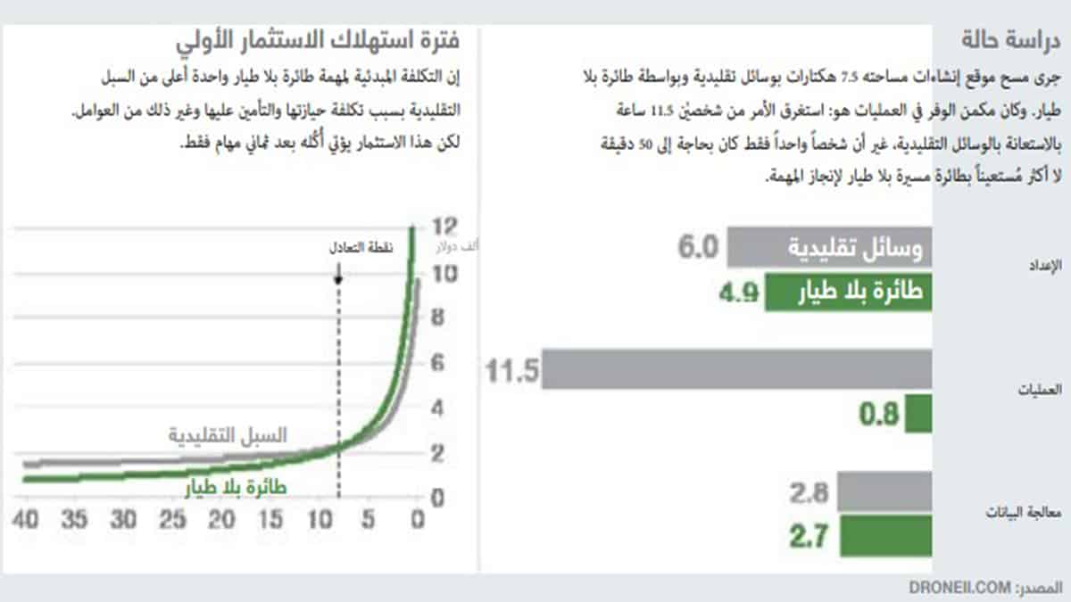تعد اقتصاديات الطائرات بلا طيار اقتصاديات مُزعزعة بطبيعتها. فبوسع تلك الطائرات حالياً أن تنجز في ساعات ما يستغرقه الناس أياماً. وتستطيع توفير بيانات بصرية شديدة التفصيل لقاء جزء من تكلفة تحصيل ذات البيانات بوسائل أخرى. وأمست تلك الطائرات جوهرية في ضمان السلامة في مكان العمل؛ حيث أغنت عن اضطلاع البشر بعمليات خطرة كفحص أبراج الهواتف الخلوية. وهي تكفل إطلالة جديدة على الأعمال: فمنظورها العلوي المنخفض يجلب رؤى وقدرات جديدة للحقول والمصانع على حد سواء.