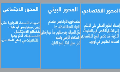 يفسّر الشكل السابق التأثير الثلاثي على الأرباح والذي يأتي من أي تغيير في أعمال الشركة، حيث يُظهر بأنه حتى لو كانت الشركة تُبلي بلاء حسناً في المحور الاقتصادي، يجب أن تولي الاهتمام أيضاً لدورها وتأثيراتها الخارجية الإيجابية والسلبية المحتملة في المحورين الاجتماعي والبيئي. وبناء عليه، ولكي تُعتبر أي شركة مستدامة بيئياً، يجب أن تتمتّع بأرباح ثلاثية متوازنة جيداً. وإذا ما أخذت العلامات التجارية بحسبانها أنّ صناعة الأزياء السريعة لها تبعات سلبية مباشرة على الأرباح الثلاثية، فإنّ استهدافها لهذه المحاور سيساعدها في المعالجة المباشرة للجوانب السلبية لهذه الصناعة.