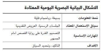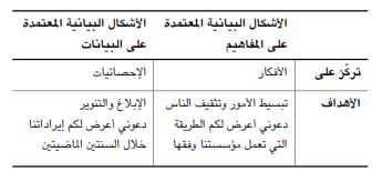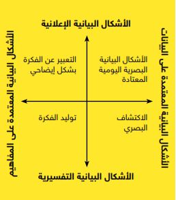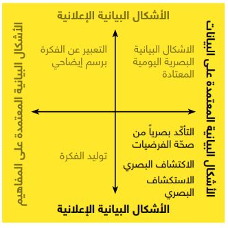 إن الأسئلة المتعلقة بطبيعة الأشكال البيانية والغرض منها تجتمع معاً على شكل مصفوفة رباعية (2X2) ينجم عنها أربعة أشكال من التواصل البصري: التعبير عن الفكرة برسم إيضاحي، وتوليد الفكرة، والاكتشاف البصري، والأشكال البيانية البصرية اليومية المعتادة.
