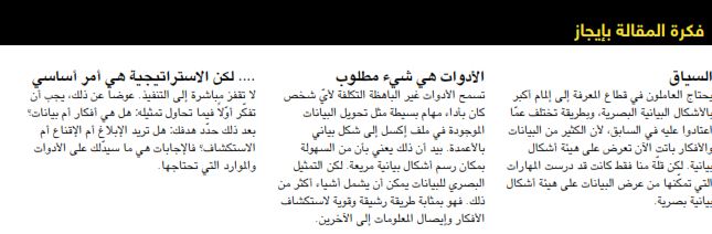 قبل فترة غير بعيدة، كانت القدرة على رسم شكل بياني ذكي يهدف إلى تمثيل البيانات بصورة بصرية واضحة واحدة، من المهارات التي يُعتبر التمتّع بها أمراً لطيفاً. وكانت في غالب الأحيان مفيدة للمدراء المهتمين بالتصميم والبيانات والذين اتخذوا قراراً واعياً بالاستثمار في اكتساب هذه المهارة. لكن هذا الوضع تغيّر. فقد باتت مهارة التواصل البصري ضرورة أساسية يجب على المدراء التمتع بها لأنها أصبحت وبصورة متنامية الطريقة الوحيدة لفهم العمل الذي يقومون به.