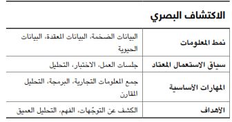 إن الاستكشاف يسمح بشي من التفاعلية: فالمدراء هنا قادرون على تعديل المتغيّرات والقواعد، وإدخال مصادر بيانات جديدة، ومحاولة إعادة صياغة الأشكال البصرية بشكل دائم ومتكرّر. كما أن بعض البيانات المعقّدة قد تكون أنسب أحياناً للأشكال البيانية البصرية المتخصّصة وغير المعتادة، مثل بعض الأشكال الإيضاحية التي تبيّن كيف يمكن للشبكات أن تشكّل مجموعات أو الأشكال الإيضاحية التي تعبّر عن معلومات تضاريسية.