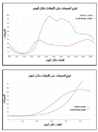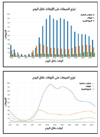 لنفترض بأن هناك مديراً للتسويق يعتقد بأن عدد الزبائن الذين يتسوّقون على موقعه على الإنترنت باستخدام أجهزة محمولة أكبر من عدد الزبائن الذين يتسوّقون باستعمال حاسب شخصي مكتبي، وذلك خلال بعض ساعات النهار، لكن برامجه غير مصمّمة للاستفادة من هذه الحالة. يقوم هذا المدير بإدخال بعض البيانات ضمن أداة متاحة على الإنترنت تسمّى (Datawrapper) ليعرف إذا كان على حق (الشكل رقم 1 إلى اليمين).