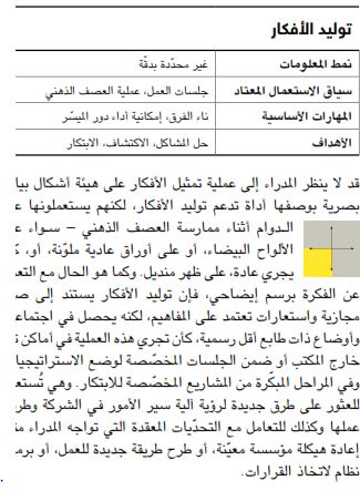 قد لا ينظر المدراء إلى عملية تمثيل الأفكار على هيئة أشكال بيانية بصرية بوصفها أداة تدعم توليد الأفكار، لكنهم يستعملونها على الدوام أثناء ممارسة العصف الذهني – سواء على الألواح البيضاء، أو على أوراق عادية ملوّنة، أو، كما يجري عادة، على ظهر منديل. وكما هو الحال مع التعبير عن الفكرة برسم إيضاحي، فإن توليد الأفكار يستند إلى صور مجازية واستعارات تعتمد على المفاهيم، لكنه يحصل في اجتماعات وأوضاع ذات طابع أقل رسمية، كأن تجري هذه العملية في أماكن تقع خارج المكتب أو ضمن الجلسات المخصّصة لوضع الاستراتيجيات، وفي المراحل المبكّرة من المشاريع المخصّصة للابتكار. وهي تُستعمل للعثور على طرق جديدة لرؤية آلية سير الأمور في الشركة وطريقة عملها وكذلك للتعامل مع التحدّيات المعقدة التي تواجه المدراء مثل: إعادة هيكلة مؤسسة معيّنة، أو طرح طريقة جديدة للعمل، أو برمجة نظام لاتخاذ القرارات.