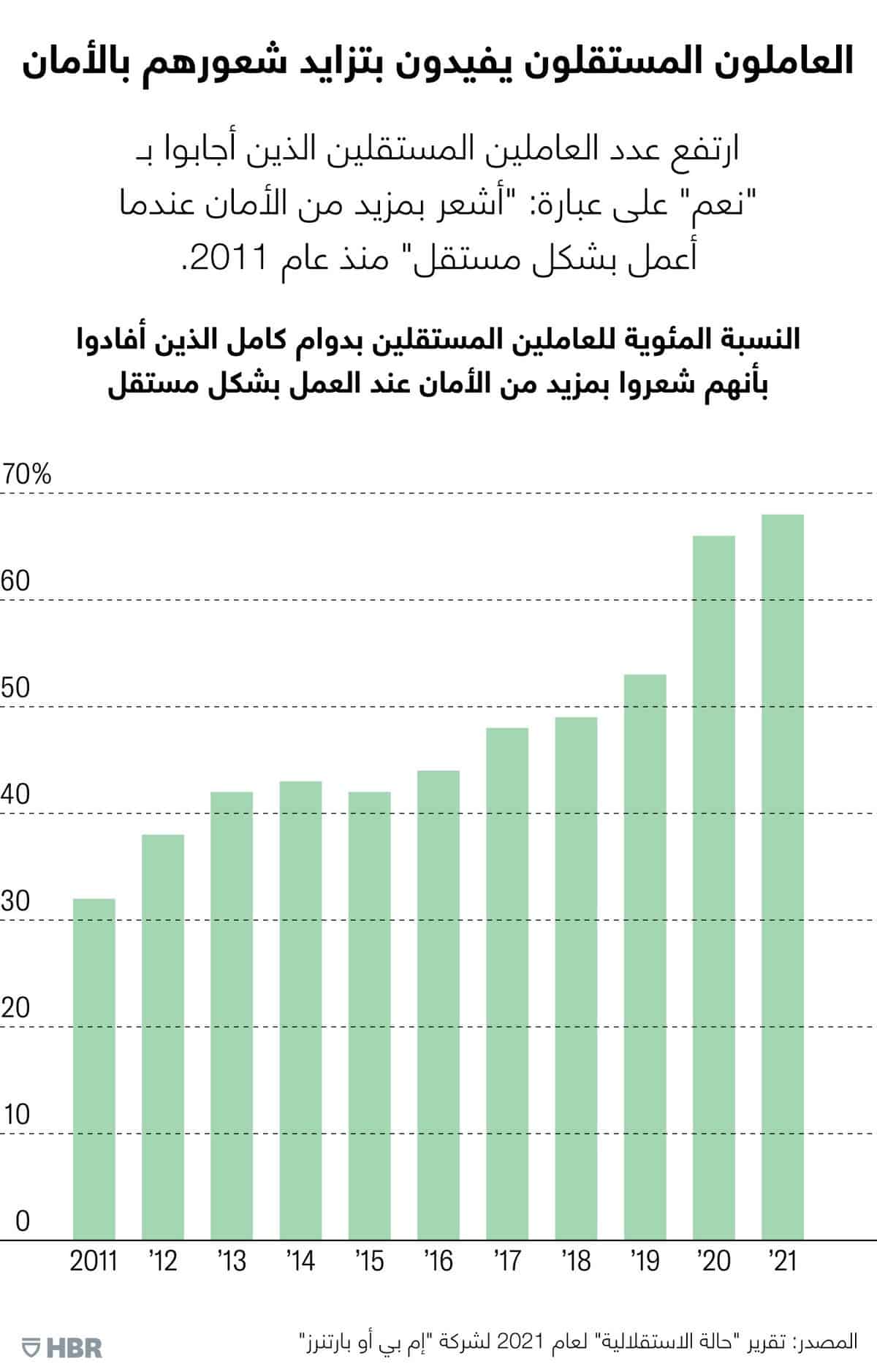 وقد أجرينا استقصاءً عام 2021 شمل 6,240 عاملاً في الولايات المتحدة، منهم 928 عاملاً مستقلاً، وأجاب 68% من العاملين المستقلين بـ "نعم" على عبارة: "أشعر بمزيد من الأمان عندما أعمل بشكل مستقل"، بعد أن كانت نسبتهم لا تتجاوز 32% عام 2011 ونحو 53% عام 2019.