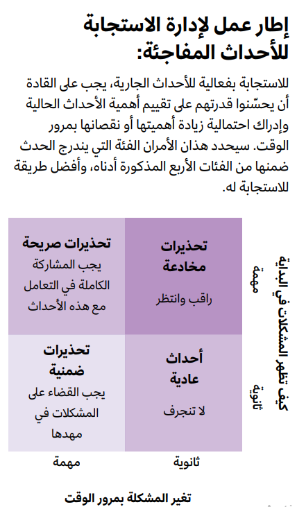 هاتان الحالتان المتناقضتان تظهران حقيقية أن هدف القائد ليس تقليل الوقت الذي يقضيه في الاستجابة للأحداث المفاجئة، بل تخصيص القدر المناسب من وقته لها. على الرغم من أن إدارة هذه الأحداث قد يبدو أحياناً أنها تشتت القائد عن الجهود اللازمة للأهداف الطويلة الأمد، فهي تظل جزءاً أساسياً من دوره ويمكن أن يؤدي الإخفاق فيها إلى تكاليف باهظة. ينجم العديد من حالات إقالة الرؤساء التنفيذيين عن أخطاء في الاستجابة للأحداث الجارية، ومهما كانت خطط القائد رائعة، فلا بد من المشكلات المفاجئة، وقد يكون التعامل معها بنجاح عاملاً مهماً لتحقيق الخطط.