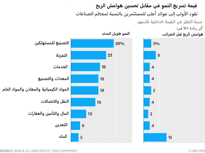 لكن هذا المتوسط لا يمثل جميع الشركات، وذلك نظراً لاختلاف كل شركة عن الأخرى فيما يتعلق بالنمو وهوامش الربح. على سبيل المثال، في بعض الصناعات – مثل البناء – يكون العائد طويل الأجل على حقوق المساهمين قريباً جداً من تكلفة رأس المال. بالنسبة لهذه الشركات، فإن اتخاذ خطوات لتحسين الهوامش سيولد عوائد أعلى للمستثمرين من تلك التي تهدف إلى تعزيز النمو. لكن في معظم القطاعات الأخرى، تكون عوائد حقوق المساهمين أكبر بكثير من تكلفة رأس المال. في هذه الظروف، يجب على المستثمرين تقييم الاستراتيجيات التي تسرّع النمو أمام تلك التي تحسن هوامش الربح (انظر الرسم البياني أدناه).