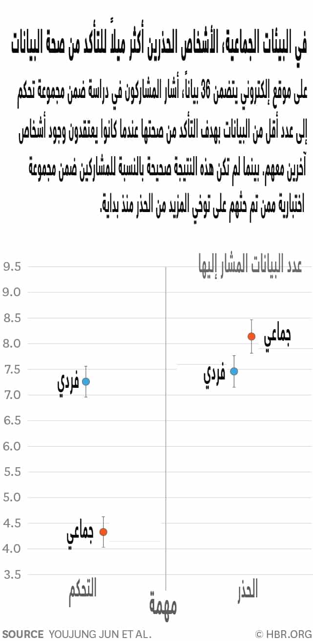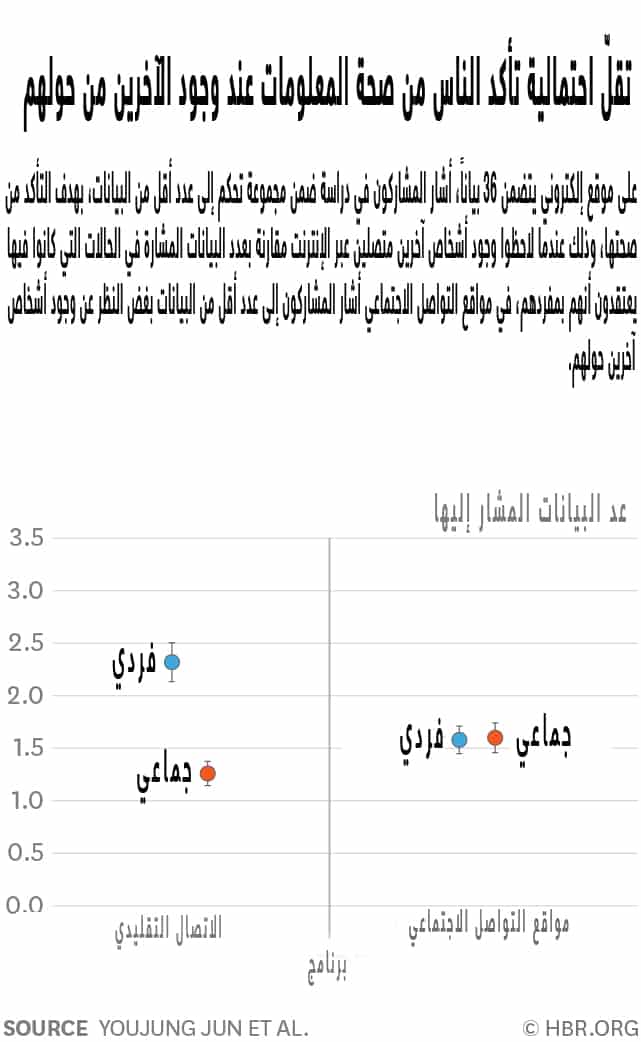 بدأنا باختبار تأثير السياق الذي تُعالج فيه المعلومات على استعدادنا للتحقق من الادعاءات الغامضة. وتوصلنا بناء على ما تكشفه نتائج ثمان تجارب إلى أنّ نسبة تأكد الناس من الحقائق تقل عندما يقيّمون البيانات في بيئة جماعية (مثلاً ضمن مجموعة أو عبر وسائل التواصل الاجتماعي) أكثر من الحالات التي يكونون فيها بمفردهم. يعود تفسير هذا الأمر إلى أنّ إدراك حضور الآخرين يقلل من يقظة وحذر المشاركين عند معالجة المعلومات، ما ينتج عنه تدني مستويات التأكد من الحقائق.