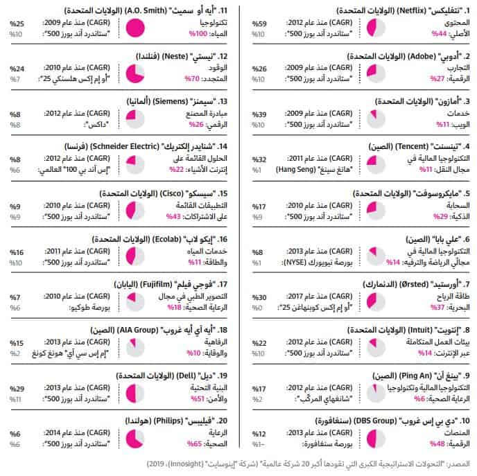 أصبحت القدرة على التكيف أكثر أهمية من ذي قبل. ولكن ما الشركات التي تواجه هذا التحدي على النحو الأمثل؟ للإجابة عن هذا السؤال، قيّم الباحثون شركات "ستاندرد آند بورز 500" والشركات المدرجة ضمن قائمة مجلة "فوربس غلوبال 2000" وفقاً لثلاثة أبعاد: ابتكار العروض ونماذج الأعمال الجديدة،