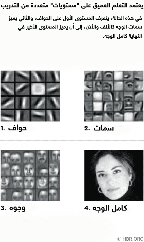 أولاً، طوّر جيفري هينتون وغيره من الباحثين في جامعة تورنتو طريقة مبتكرة لجعل العصبونات البرمجية تعلّم نفسها بجعل تعلمها يحدث في مستويات. (يقسّم هينتون وقته الآن بين جامعة تورنتو وجوجل). مستوى أول من العصبونات يتعلم كيف يميز السمات الأساسية، مثلاً حافة أو محيط، بإطلاق الملايين من نقاط البيانات إليه. حالما يتعلم هذا المستوى كيفية التعرف على هذه الأشياء بدقة، تُلقن إلى المستوى التالي الذي يدرب نفسه على تحديد ميزات أكثر تعقيداً، مثل، أنف أو أذن. ثم يتم تلقين هذا المستوى إلى مستوى آخر يدرب نفسه للتعرف على مستويات أكثر تجريداً، وهكذا دواليك، مستوى بعد آخر (من هنا جاءت كلمة عميق في التعلم العميق) إلى أن يصبح بإمكان النظام التعرف بصورة موثوقة على ظاهرة شديدة التعقيد، كوجه إنسان.