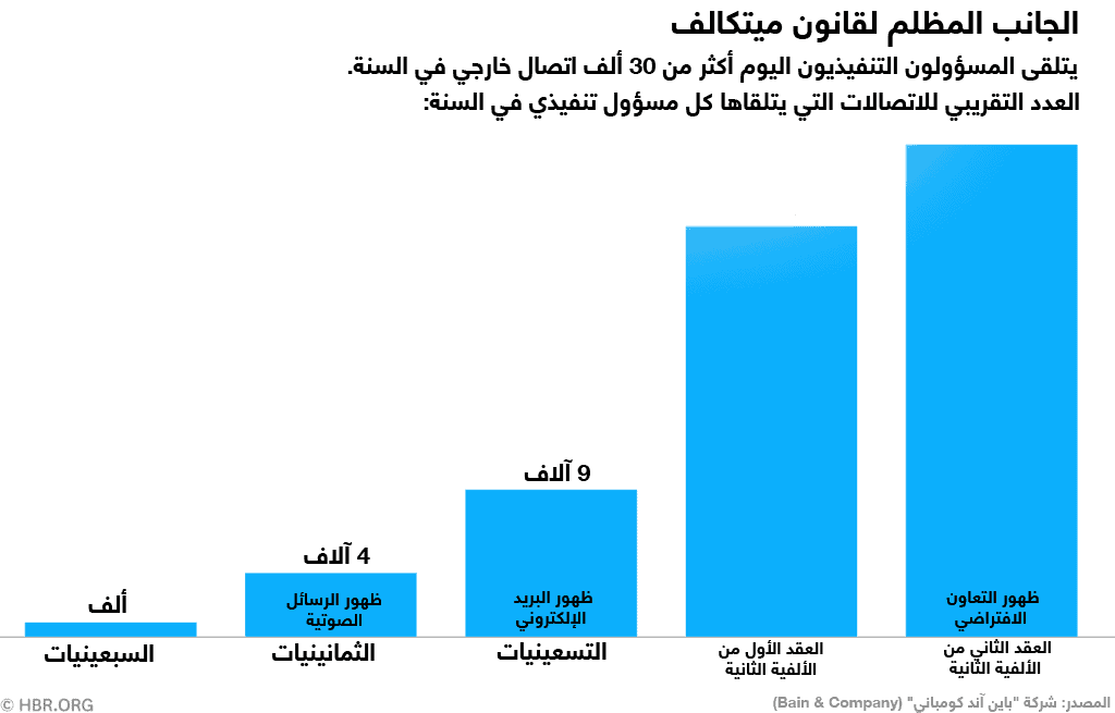 ومع ذلك، فإن "قانون ميتكاف" له جانب مظلم: فمع انخفاض تكلفة الاتصالات، يزداد عدد التعاملات بشكل كبير، كما يزداد الوقت اللازم لمعالجتها، حيث يمكن ملاحظة هذا التأثير في مكان العمل. قبل ثلاثين عاماً، عندما اتخذ المسؤولون التنفيذيون أو المدراء قراراً عبر الهاتف أثناء وجودهم في الخارج، تلقوا إشعارات إقالتهم من العمل من سكرتيراتهم وقالوا إن شخصاً ما هو من أصدر القرارات. قد يتلقى مسؤول تنفيذي نشيط ما يصل إلى 20 رسالة في المتوسط في اليوم، أو حوالي 5,000 رسالة في السنة. بعد ذلك، جاء البريد الصوتي للمستخدم الفرد، يليه البريد الصوتي متعدد الأفراد (وهو إصدار ما قبل البريد الإلكتروني الذي يتميز بخاصية "الرد على الكل")؛ وبالتالي، تراجع تكلفة ترك رسالة، وارتفع عدد الرسائل المتبقية وفقاً لذلك، ربما يصل العدد إلى 10,000 رسالة سنوياً. ثم، أخيراً، ظهرت مستويات إدارية للشبكات اليوم - مثل الهاتف، والبريد الإلكتروني، والمراسلات الفورية وما إلى ذلك- حيث تصل تكلفة التواصل مع شخص واحد أو مئات الشخاص إلى لا شيء تقريباً. إذاً، ليس من المستغرب أن يزداد عدد الرسائل، وربما يصل إلى 50,000 رسالة في السنة (الشكل 1).