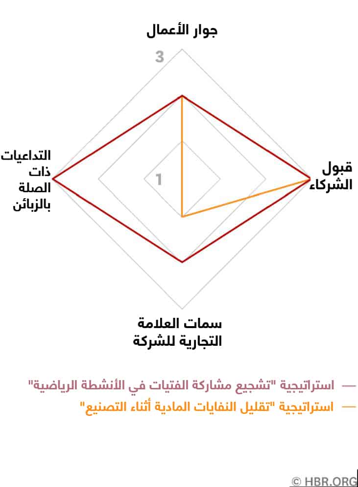 وبرسم هذه النقاط بيانياً في شكل شبكة عنكبوتية يتّضح أن استراتيجية "تشجيع مشاركة الفتيات في الأنشطة الرياضية" تخلق للشركة قيمة أكبر وتخفّف عليها المخاطر أكثر من استراتيجية "تقليل النفايات المادية أثناء التصنيع".