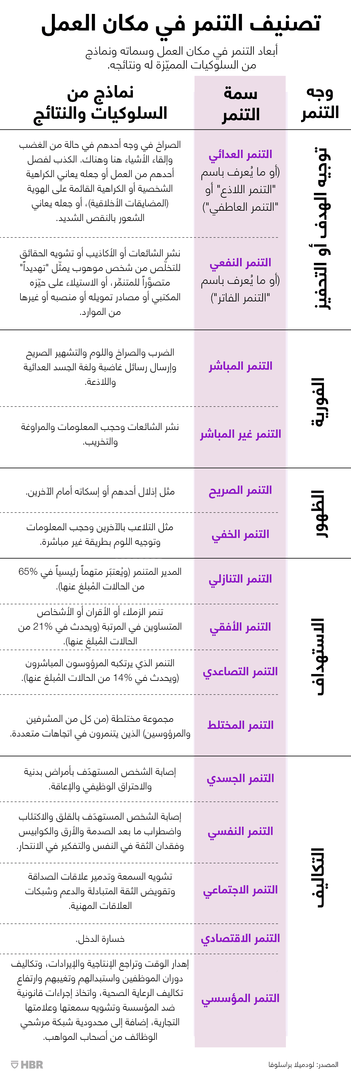 ويشمل مصطلح التنمر في مكان العمل مجموعة واسعة من السلوكيات، ويسهم هذا التعقيد في صعوبة معالجته ويجعل التعامل معه عديم الفعالية في كثير من الأحيان. وسنناقش هنا مختلف أنواع التنمر والأفكار الخاطئة التي تقف حائلاً دون معالجة الآثار الناجمة عنه من قِبَل القادة وكيفية تدخل المؤسسات للتعامل معها بفاعلية وتأسيس مكان عمل أكثر أماناً.