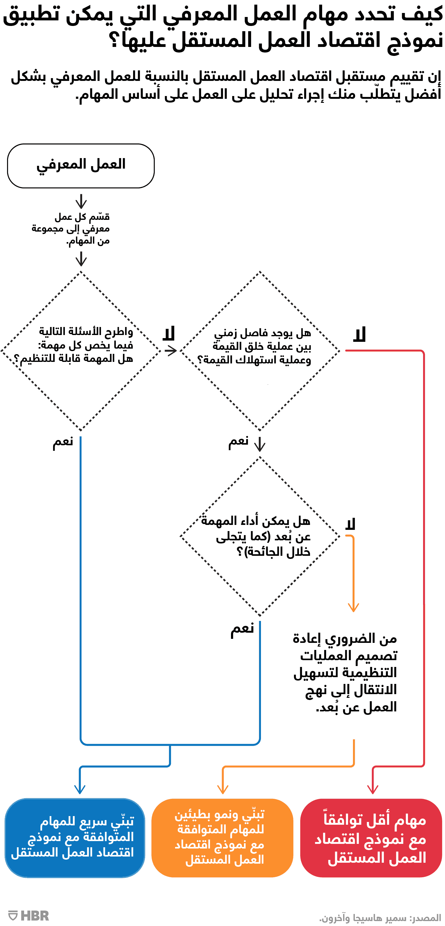 والدرس الذي يمكن أن نستخلصه هو أنه يمكننا تقسيم جميع الأعمال القائمة على المعرفة إلى مجموعة من المهام المختلفة. وبالتالي، فإن تحديد مستقبل اقتصاد العمل المستقل بالنسبة لموظفي المعرفة يتطلّب منا تحليل الأمور على مستوى المهمة وليس على مستوى العمل. وقد وجدنا أن مخطط العملية البسيط الموضح أدناه مفيد للغاية في تحديد أنواع المهام المتوافقة مع نموذج اقتصاد العمل المستقل. وتنطوي تلك العملية على طرح هذه الأسئلة الأساسية الثلاثة حول كل مهمة تتطلب معرفة مكثفة تتعلق بتقديم منتج أو خدمة ما.