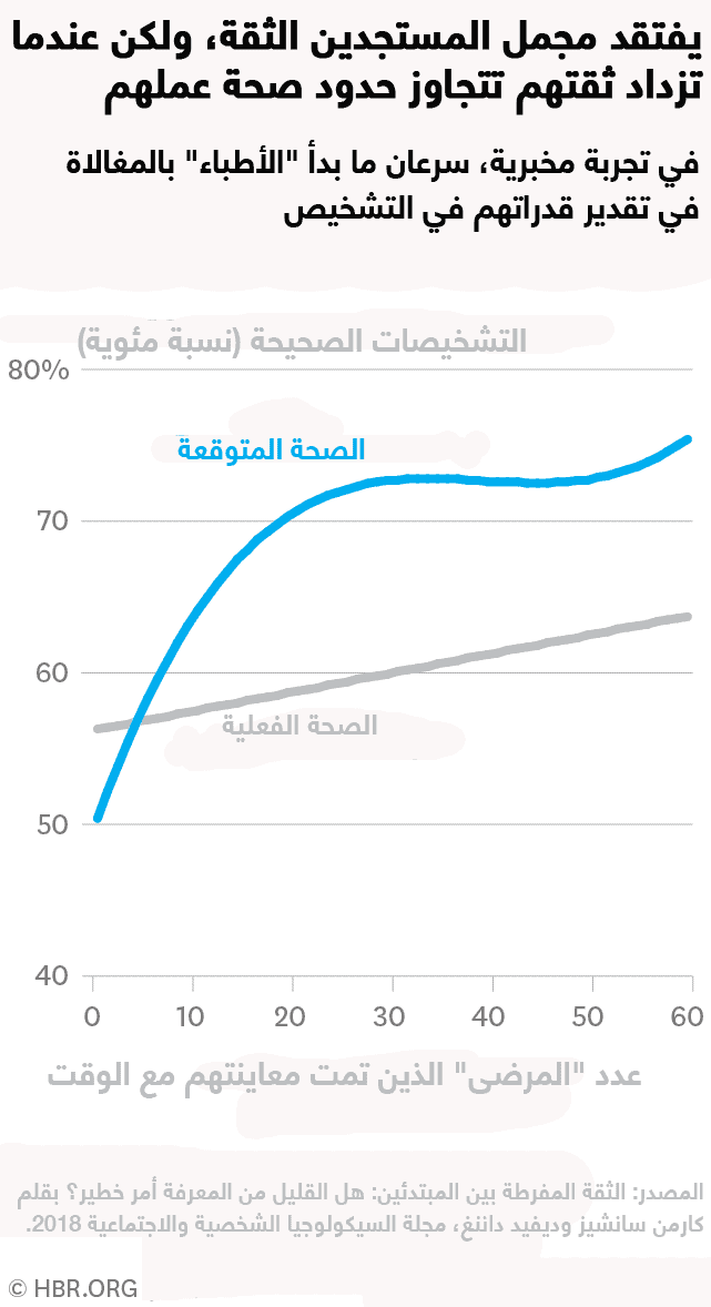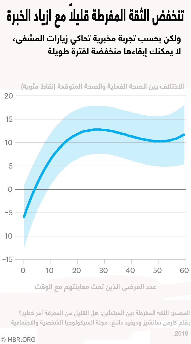 إلا أنّ الثقة سلكت مساراً مختلفاً تماماً. ففي كلتا الدراستين، بدأ المشاركون بتوقعات صحيحة لمدى صحة تشخيصاتهم. وبدأوا العمل مع اعتقاد أنهم محقون في 50 في المئة من الأوقات، وكان معدل الصحة الفعلي لهم 55 في المئة. ولكن بعد تشخيصهم لعدة مرضى، بدأت ثقتهم تزداد بصورة كبيرة جداً، متجاوزة كلّ معدلات الصحة التي حققوها فعلياً. وسرعان ما قدّر المشاركون صحة عملهم بنسبة 73 في المئة بينما لم تصل حتى إلى 60 في المئة فعلياً.
