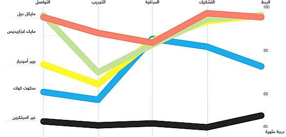 يوضّح هذا الشكل كيفية تصنيف أربعة أفراد من روّاد الأعمال المبتكرين والمشهورين على كل مهارة من مهارات الاكتشاف. سجّل جميع المبتكرين البارزين نسبة أعلى من 80% في مهارة التشكيك، ومع ذلك جمع كل منهم مهارات الاكتشاف بشكل فريد بهدف صياغة رؤى ثاقبة جديدة.