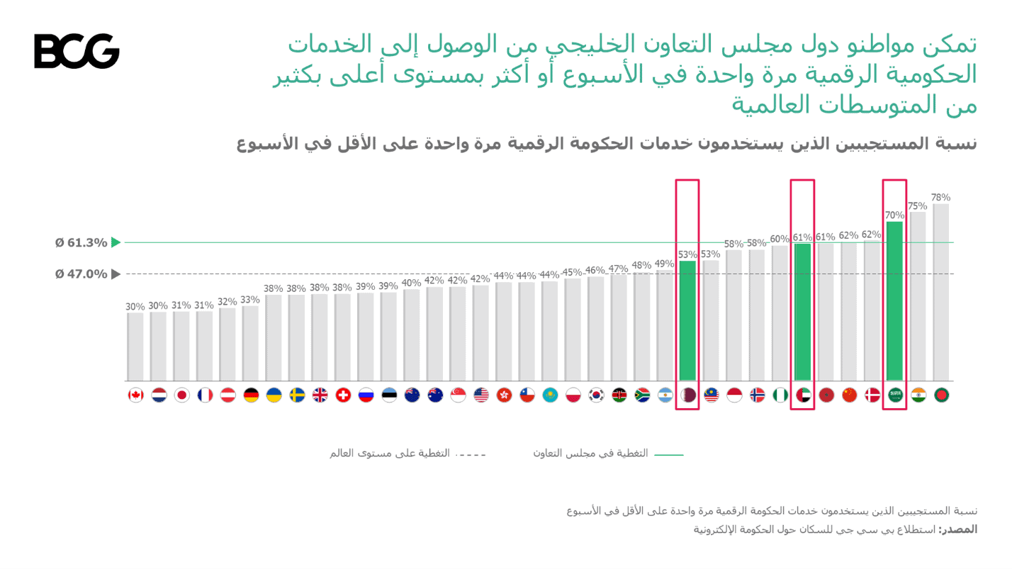 وينطبق هذا على دول مجلس التعاون الخليجي، حيث أدى انتشار جائحة "كوفيد–19" إلى زيادة الطلب للحصول على خدمات حكومية رقمية فعالة. وقد أدى تمكين السكان عبر توفير الخدمات الرقمية في مناطق جغرافية مختلفة، إلى تعزيز مكانتهم كدعامة أساسية لفترة ما بعد الأزمة. وبينما يتمتع مواطنو المنطقة والمقيمون فيها بقدرات الراحة والمرونة المكتشفة حديثاً، استطاعت الحكومات تحقيق إنجازات استثنائية، مع تسخير أطر الخدمة الرقمية ورؤى المستخدم النهائي لتحسين أنماط الحياة والرفاهية وتعزيز العلاقات بين المجتمعات، وبين الحكومات والمواطنين.