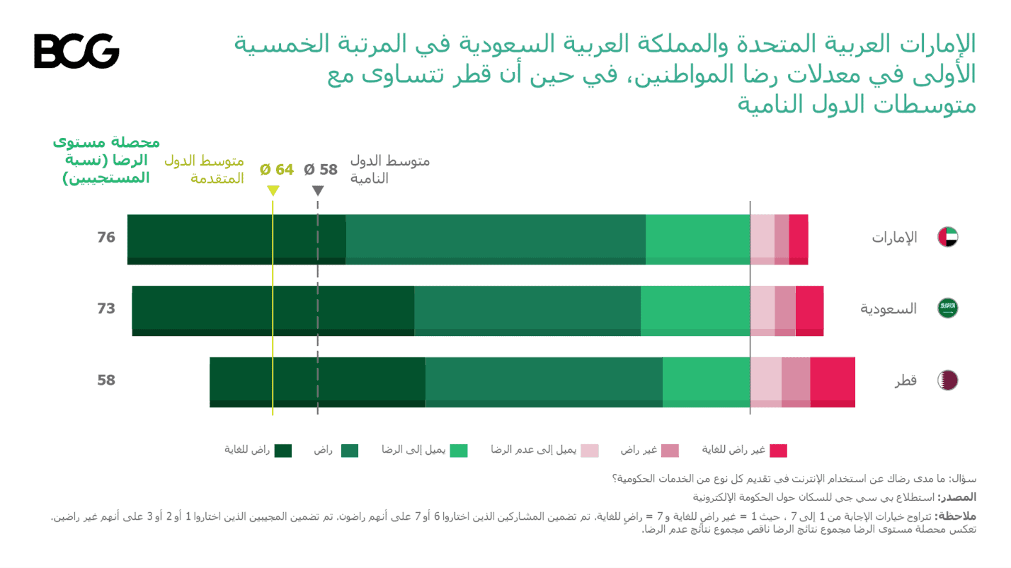 وأظهر الاستطلاع رضا المشاركين عن الخدمات الحكومية الرقمية المقدم، حيث احتلت الإمارات العربية المتحدة والمملكة العربية السعودية المراتب الأولى في درجات الرضا بمعدل 76% و73% على التوالي مقارنة بالمتوسطات العالمية. وبالمثل، سجلت قطر درجة رضا متوافقة مع متوسط البلدان النامية البالغ 58%.
