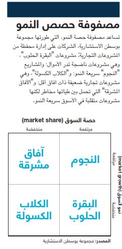 لكي تقدر قيمة الآثار الاستراتيجية لأي نشاط استثماري تقليدي، فمن المفيد استخدام أداة طُورت في ستينات القرن الماضي على يد "بوسطن كونسلتينغ جروب" لإرشاد عملية تخصيص الموارد. ساعدت الأداة، التي تعرف بـ "مصفوفة حصة النمو" (مصفوفة بوسطن)، المديرين لينظروا إلى شركاتهم على أنها محفظة من المشروعات التجارية ذات الخصائص المختلفة. قد تكون مجموعة من المشروعات ناضجة وتتطلب استثمارات فقط من أجل أهداف التوسع المتواضع والتطوير التدريجي. وبافتراض امتلاكهم لحصة سوقية قوية بالمقارنة مع أقرب منافسيهم، تكون هذه المشروعات مربحة على الأرجح ومدرة للسيولة النقدية. وقد تحظى مجموعة أخرى بمراكز متقدمة ولكن في الأسواق سريعة النمو، فهذه الأنواع من المشروعات هي أيضاً مربحة لكنها تتطلب استثمارات ضخمة لكي تحافظ على حصتها السوقية أو تزيدها. ثمة مجموعة ثالثة ربما تكون في حالة تنافسية ضعيفة في الأسواق الناضجة؛ حيث تحتاج هذه المشروعات إلى السيولة النقدية لكي تستمر، ولكنها لا تمتلك آفاق النمو أو زيادة الأرباح. قد تكون آخر هذه المجموعات في أسواق جديدة سريعة النمو، حيث تتنافس العديد من الشركات كما أن احتمالات النجاح كبيرة لكنها ترتبط بمخاطر عالية.