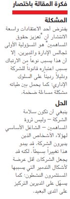 - يريد المساهمون أن يسير العمل بطريقة تعزز من عوائدهم الاقتصادية (الافتراض بأن المساهمين مجمعون على هذا الهدف يبرز ضمنياً خلال سطور المقال).