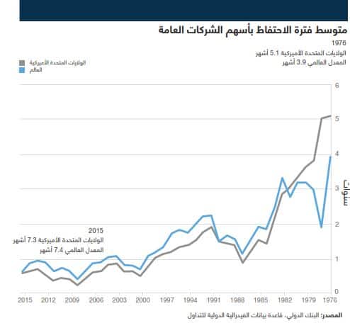 وتكون النتيجة عائد دوران أعلى للأسهم (الذي يتضح في الملحق "متوسط فترة الاحتفاظ بأسهم الشركات العامة)، والذين ينتج أيضاً عن تداول ضمن مستويات مرتفعة الوتيرة من قبل المضاربين.