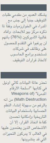 بدت كريستين منزعجة، وقالت: "أُقدر حذرك يا براد، ولكننا سمعنا من مسؤولي قسم التوظيف أن نوع التوصيات التي بدأت تقدمها الخوارزميات والبيانات باتت تغير الطريقة التي يفكرون بها حول المناصب والمرشحين. كما أننا جربنا النظام الجديد لعدة أشهر حتى الآن دون مشكلات.