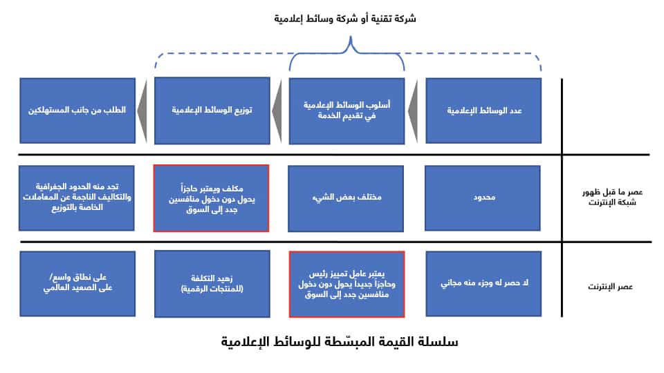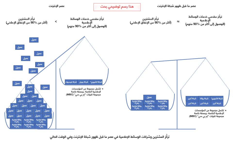 وعلى الرغم من أن منطقة الشرق الأوسط وشمال أفريقيا ظلت دائماً تعاني من صِغر حجم أسواق الإعلانات والقنوات التلفزيونية المتوفرة بالاشتراك، نسبياً، إلا أن تلك الفترة كانت جيدة للغاية بالنسبة إلى معظم الشركات الإعلامية والإعلانية التي كانت تدار باحترافية في عصر ما قبل ظهور شبكة الإنترنت. وبالتأكيد، كان على الشركات الراسخة التكيّف عندما حوّل المستهلكون جل اهتمامهم إلى أشكال جديدة من الوسائط الإعلامية (على سبيل المثال، من المحطات الإذاعية إلى القنوات التلفزيونية). بيد أنه كان ثمة أمر ثابت فيما يتعلق بالصحف والمجلات والمحطات الإذاعية والقنوات التلفزيونية؛ إذ كان عدد الشركات الإعلامية محدوداً. ولذا، كانت المنافسة محدودة، وكانت العوائد التي تحققها هذه الشركات مجزية للغاية.
