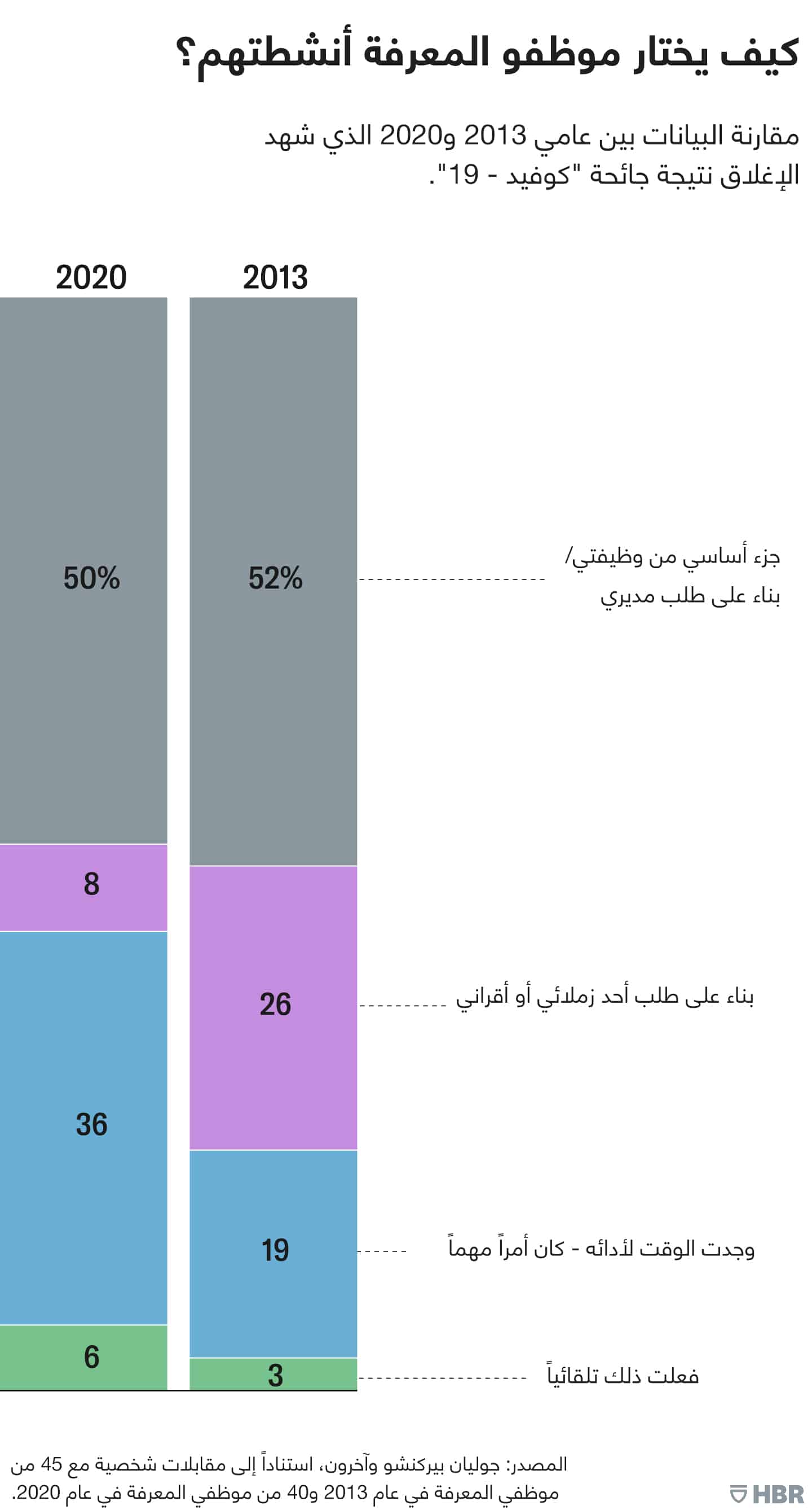 قضى موظفو المعرفة ثلثي وقتهم عام 2013 إما في "الإدارة الأفقية" في الاجتماعات المنعقدة في الغالب مع عدد كبير من الزملاء، أو في تنفيذ "الأعمال المكتبية" بمفردهم. أما الأعمال التي تركز على الشركاء الخارجيين (مثل التحدث إلى العملاء)، والإدارة التنازلية (ممثلة في التدريب ودعم المرؤوسين) والإدارة التصاعدية (ممثلة في التفاعل مع المدير وغيره من كبار الموظفين) فكلها لم تحصل سوى على القليل من الوقت، بينما لم يحصل التدريب وتطوير الذات على أي جزء من الوقت تقريباً.