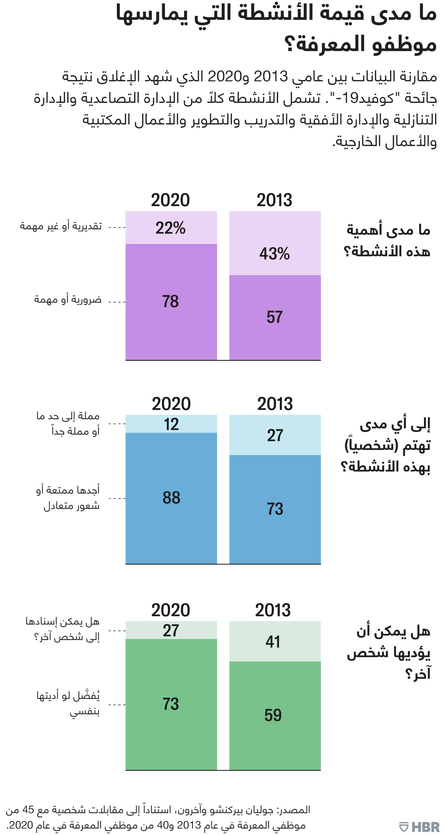 أجرينا استقصاء عام 2013 جمعنا فيه بيانات عن 329 نشاطاً محدداً يؤديها 45 موظفاً في حقل المعرفة، وأجرينا استقصاء عام 2020 وتحديداً خلال شهر مايو/أيار ومطلع يونيو/حزيران جمعنا فيه بيانات عن 264 نشاطاً من 40 فرداً. تم اختيار الأفراد بشكل عشوائي وفق معايير محددة، ممثلة فيما يلي: الحصول على درجة البكالوريوس على الأقل وامتلاكهم خبرة لا تقل عن خمس سنوات في العمل بدوام كامل والعمل في وظيفة تتحدد فيها الفاعلية باستخدام القدرة العقلية والقدرة على إصدار أحكام سليمة، وهكذا اختلفت أعمار المشاركين وخبراتهم والقطاعات التي يعملون بها.