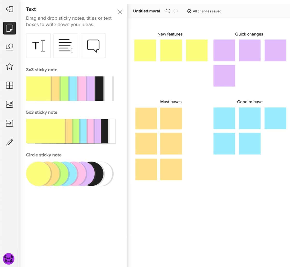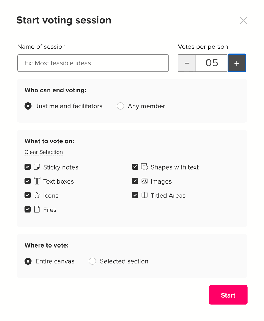 بمجرد الانتهاء من توليد الأفكار وتنظيف اللوحة، حان الوقت للقيام بالخطوة التالية. إذا كنت تعقد اجتماعاً، فخصص الخمس إلى 10 دقائق التالية لجلسة تقييم دون الكشف عن الهوية حيث يمكن لأعضاء الفريق التعليق على الإسهامات المفضلة أو تقييمها أو التصويت لها. (موضح أدناه مثال لجلسة تصويت في تطبيق ميورال).